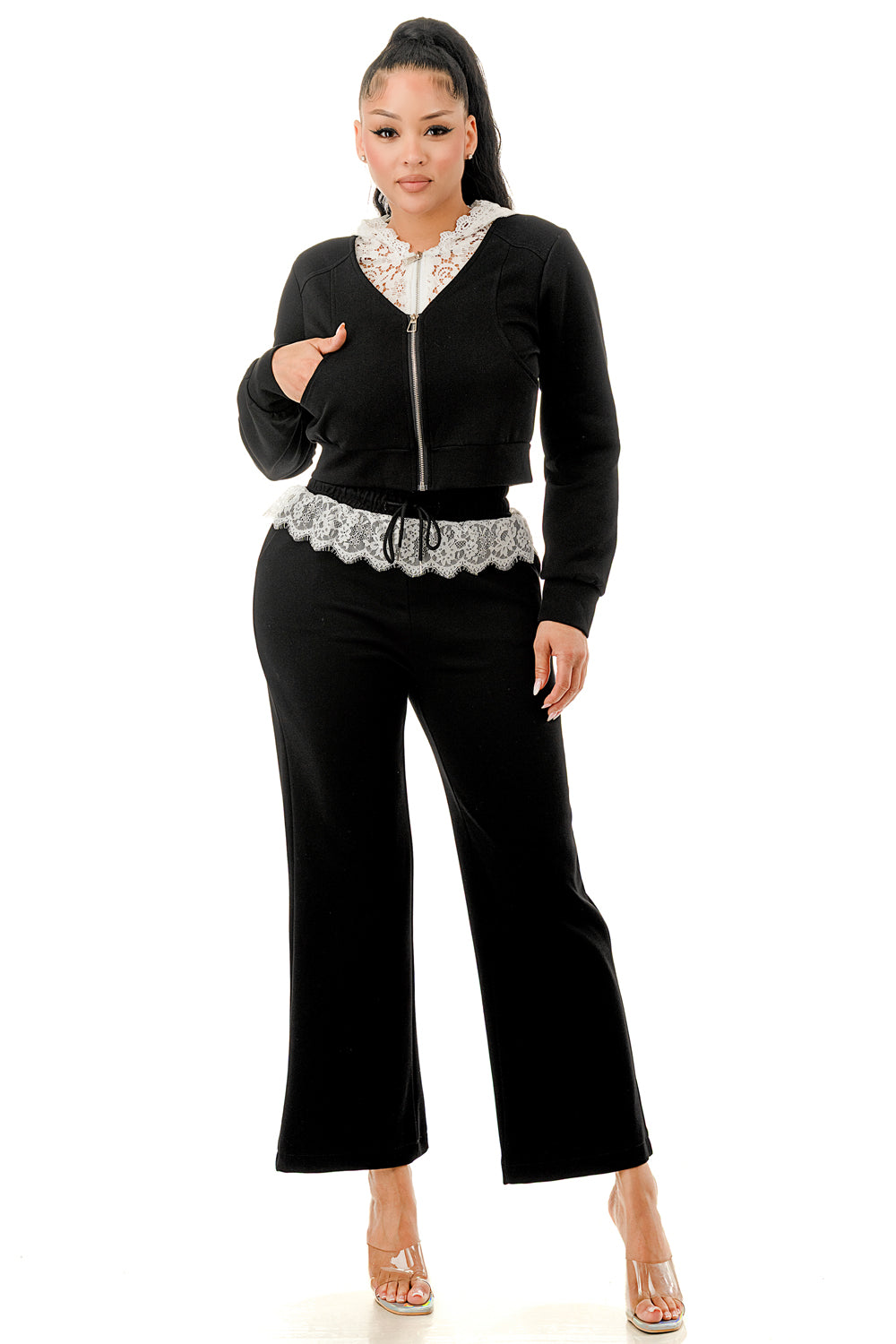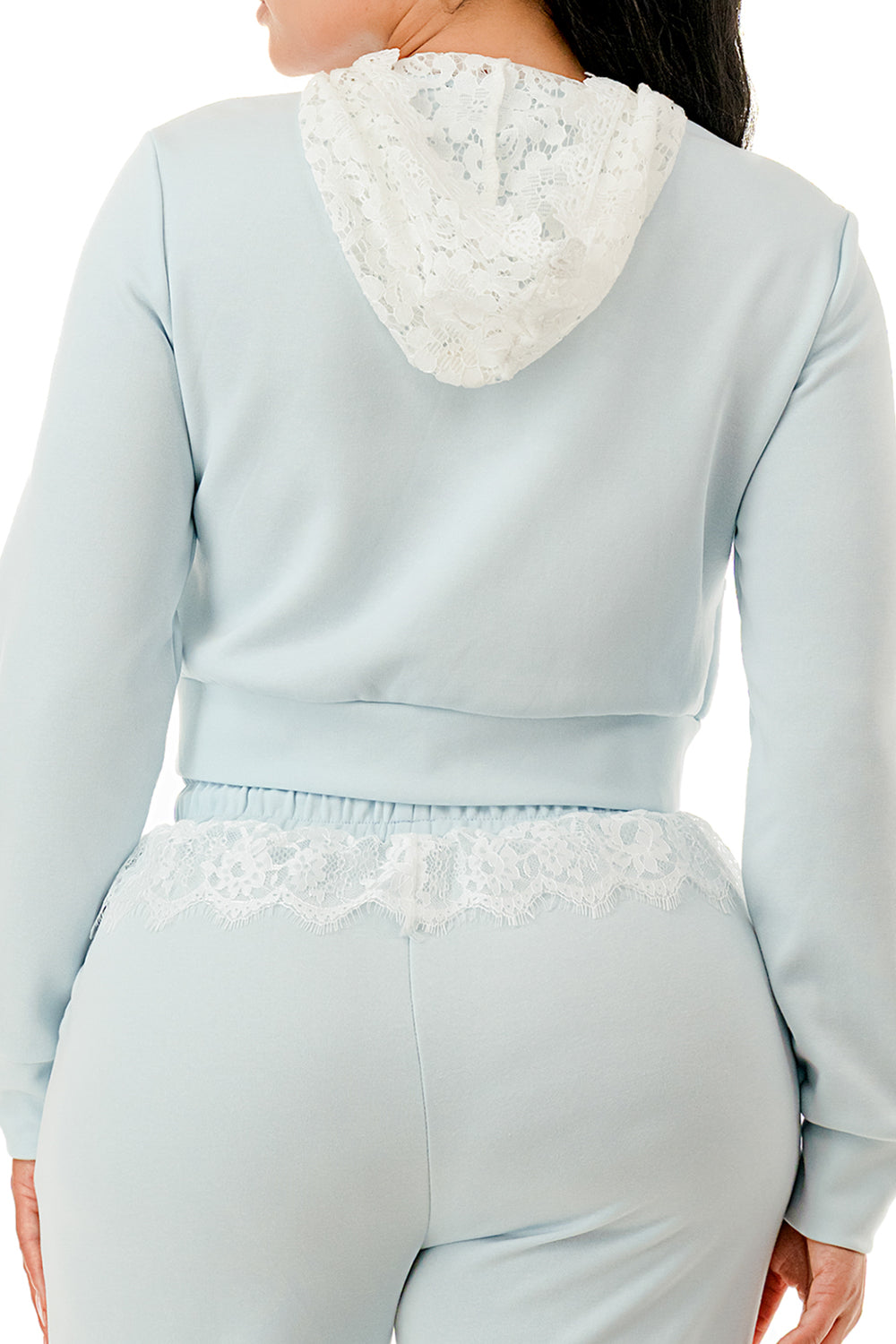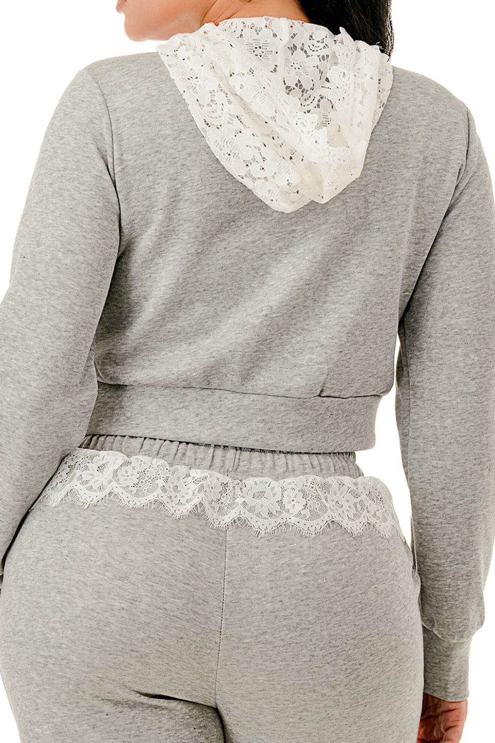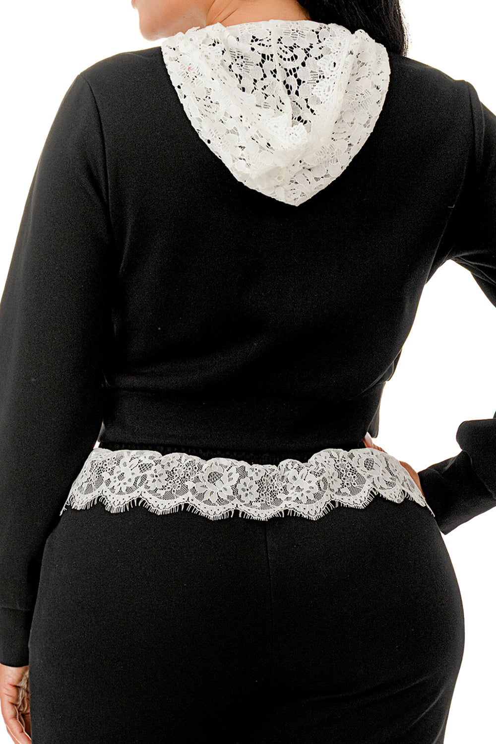 Sweater pant set. Top with inner lace lining and lace hood. Full zip up sweater top.