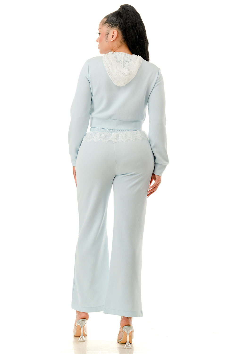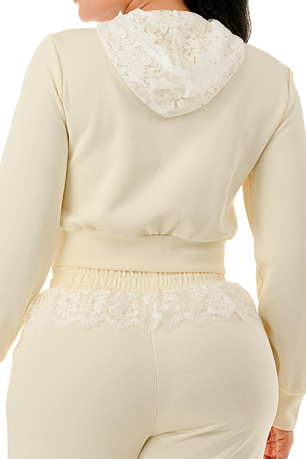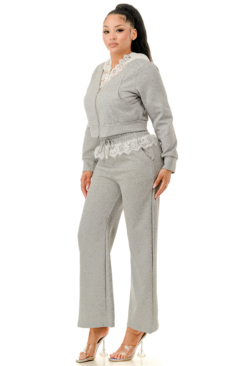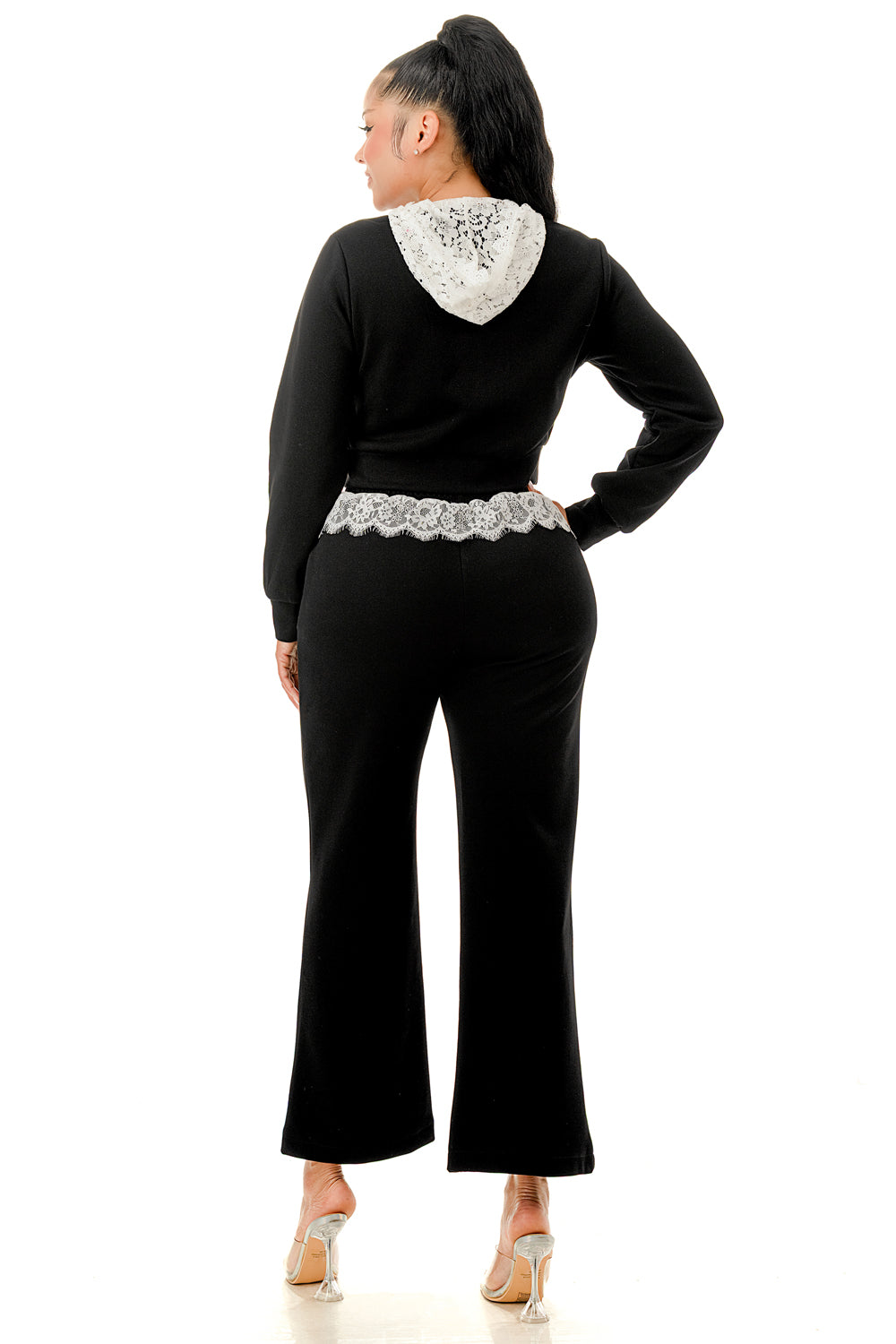 Sweater pant set. Top with inner lace lining and lace hood. Full zip up sweater top.