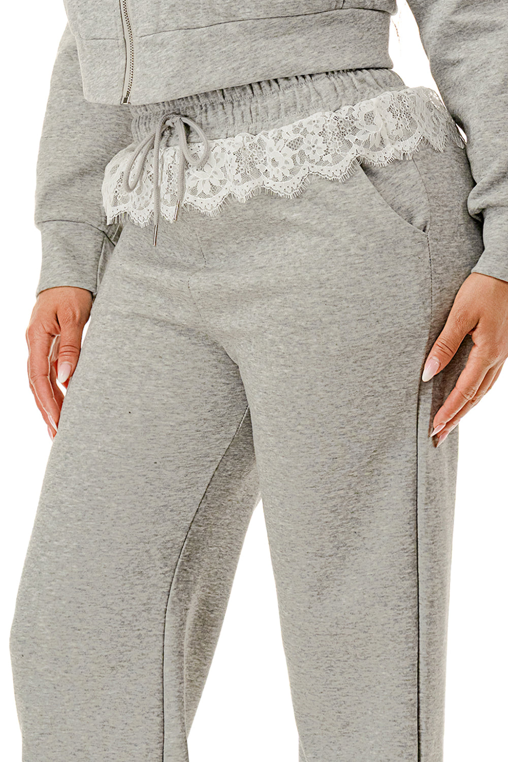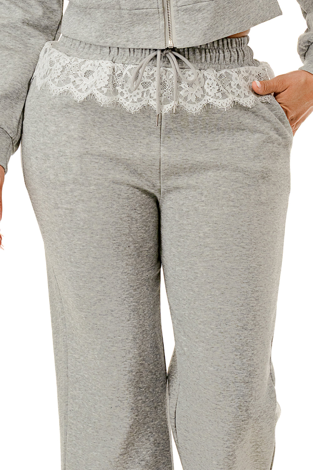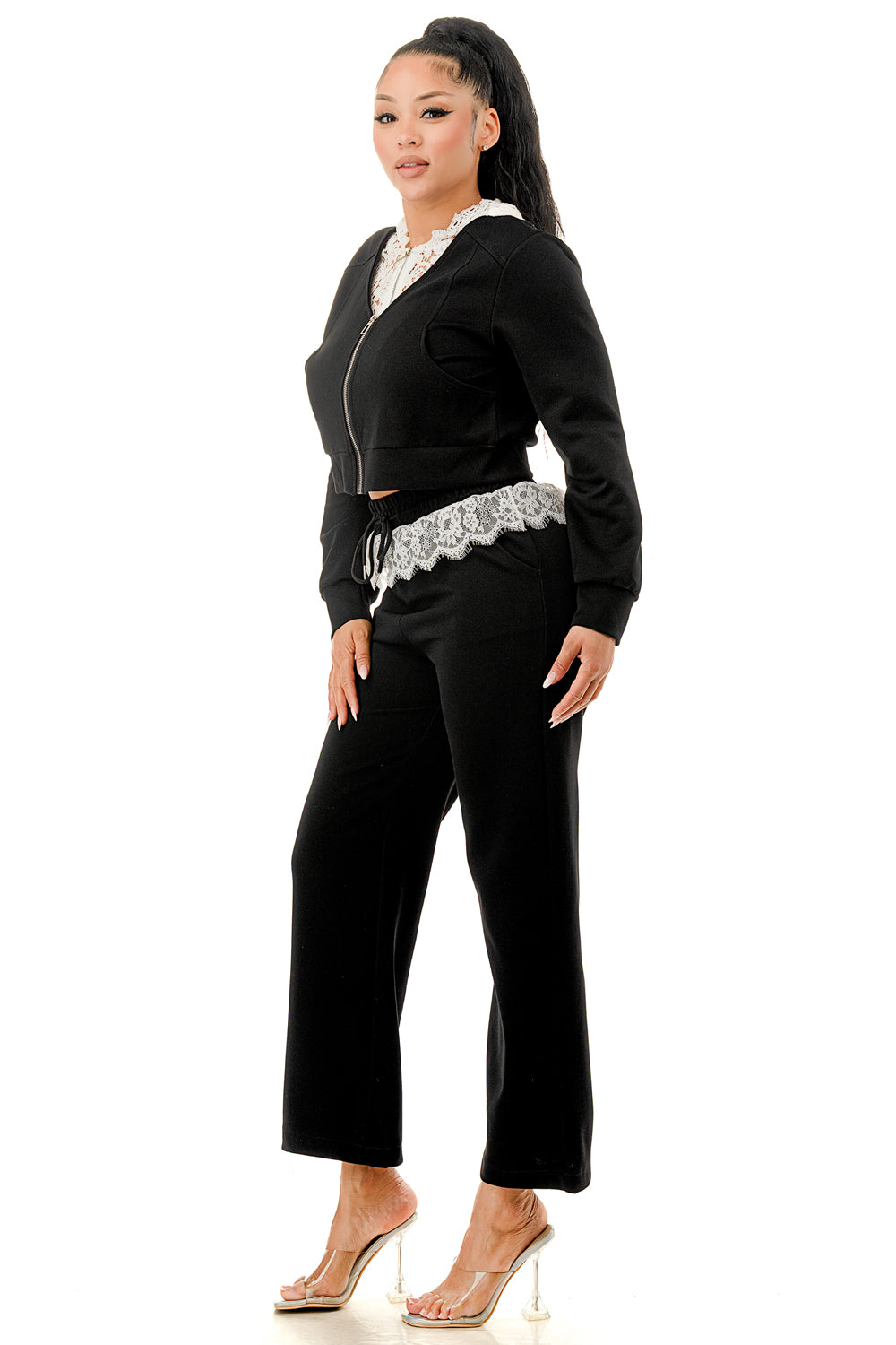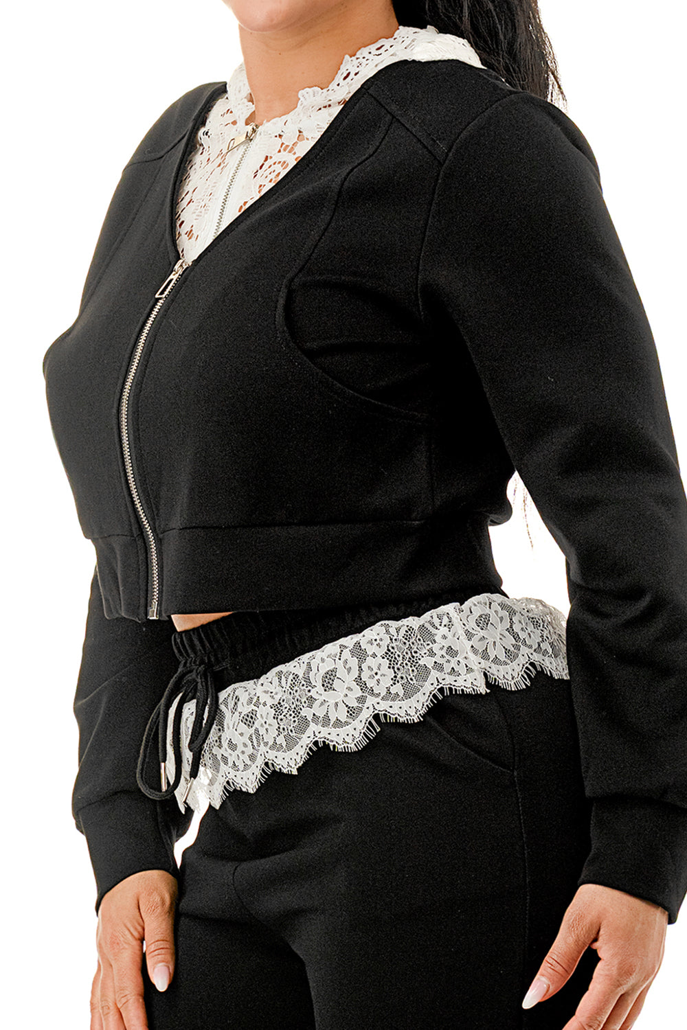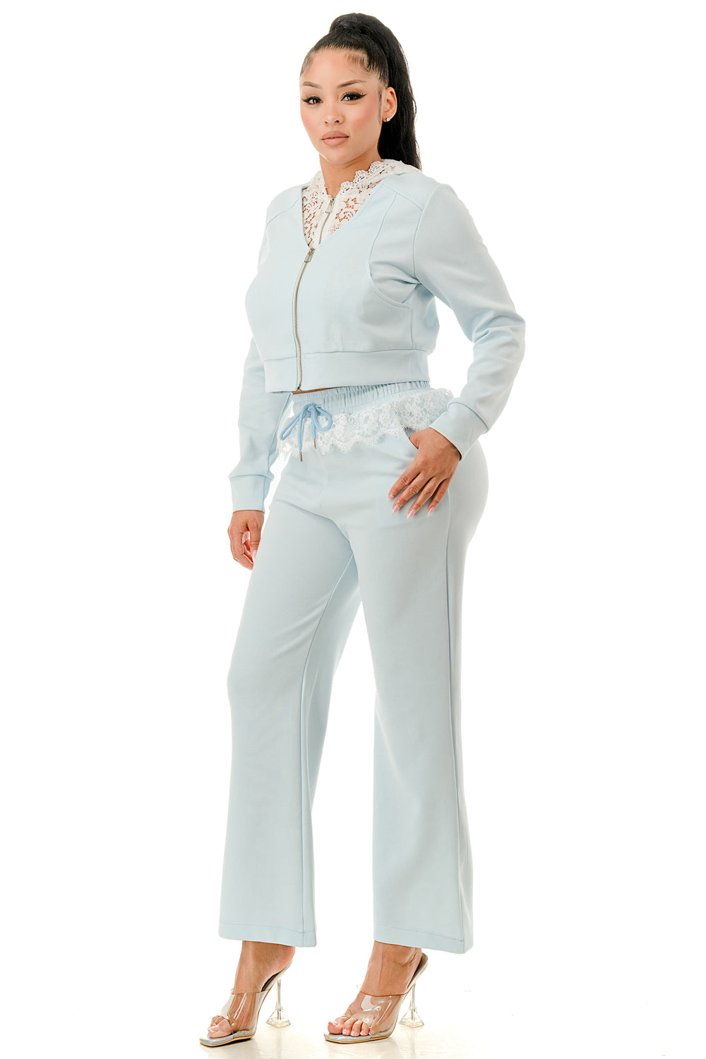 Sweater pant set. Top with inner lace lining and lace hood. Full zip up sweater top.