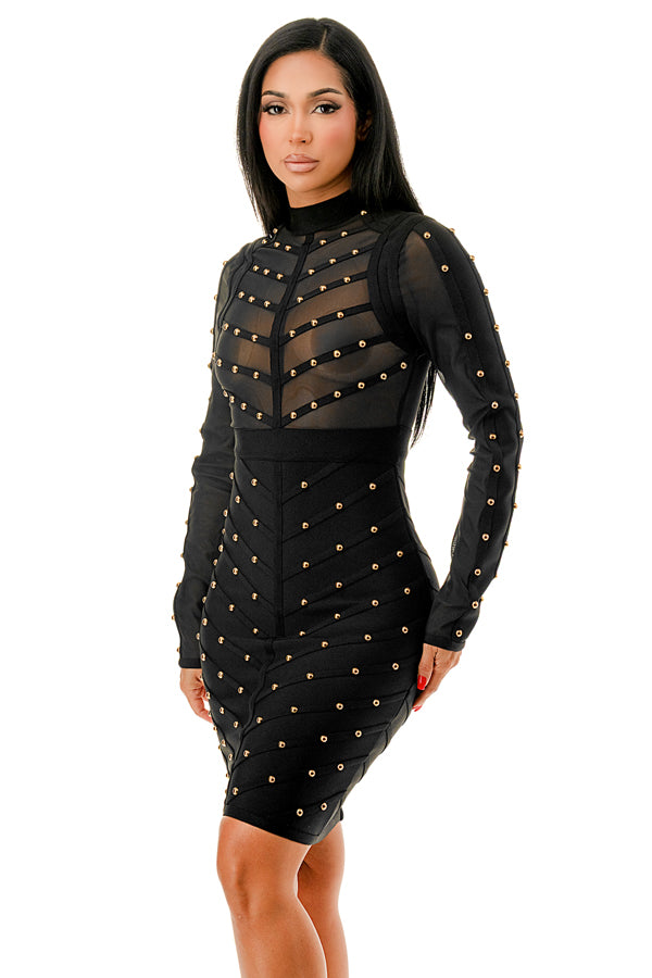 Long sleeve mini bandage dress with mesh contrast and stud detail.