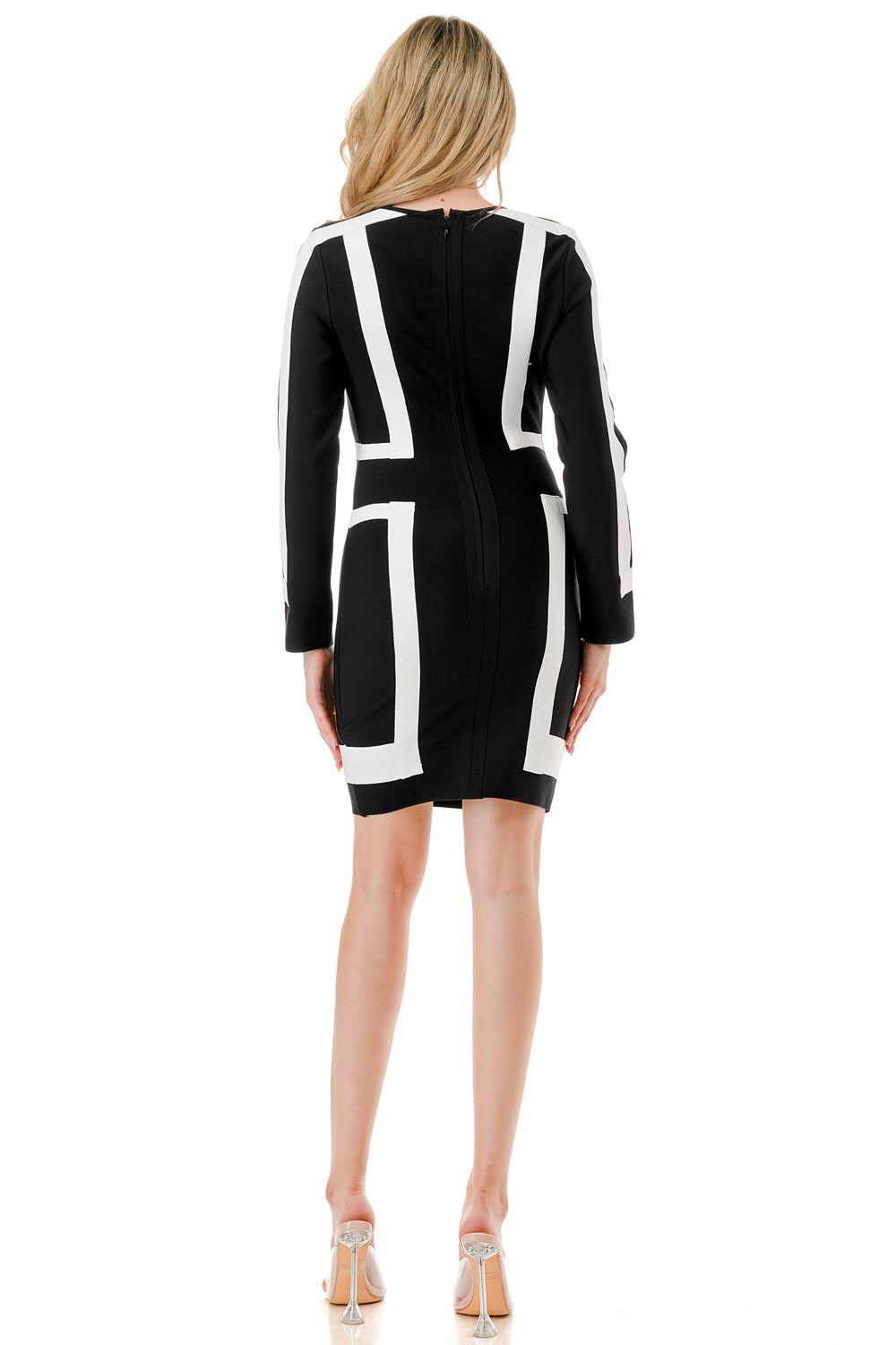 Long sleeve two-tone contrast bandage dress.