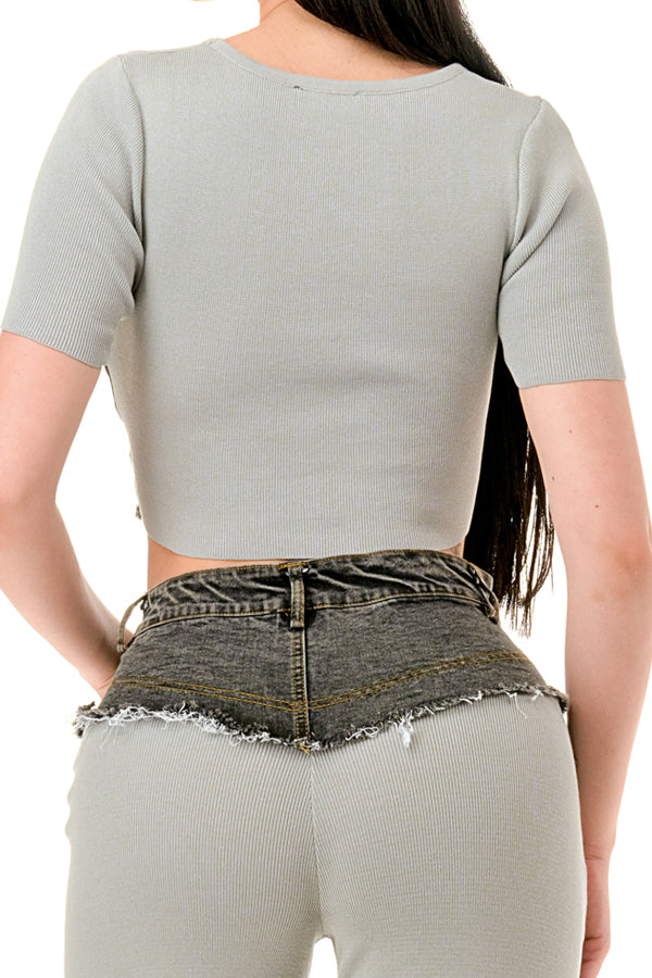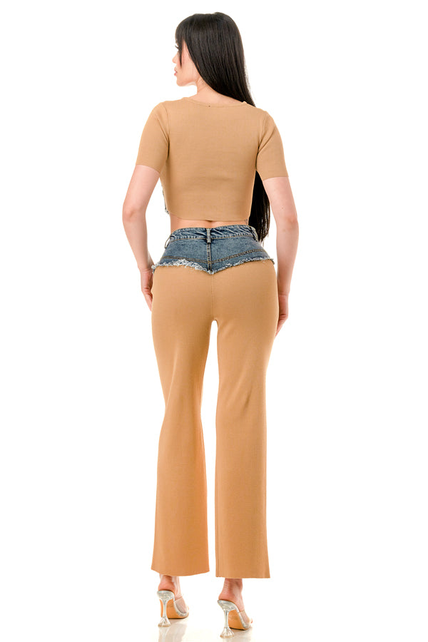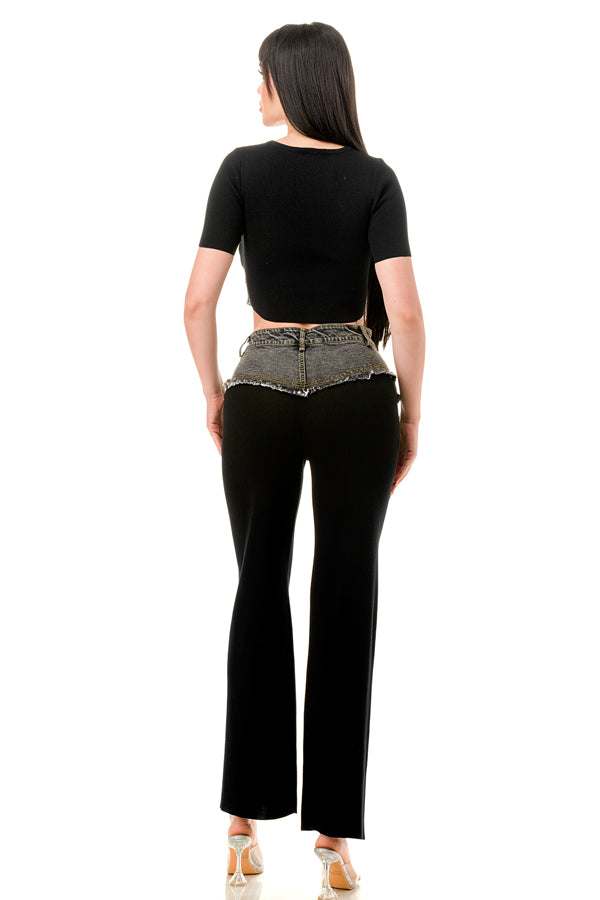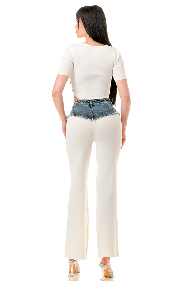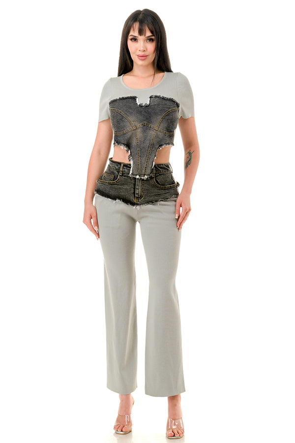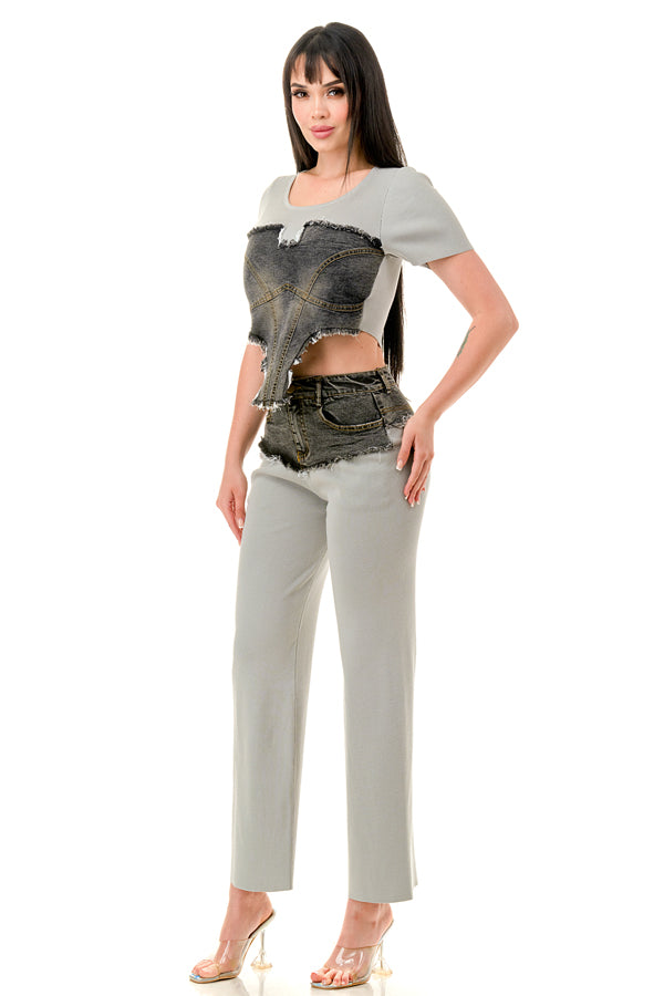 Denim Contrast Crop Top and Pants Set