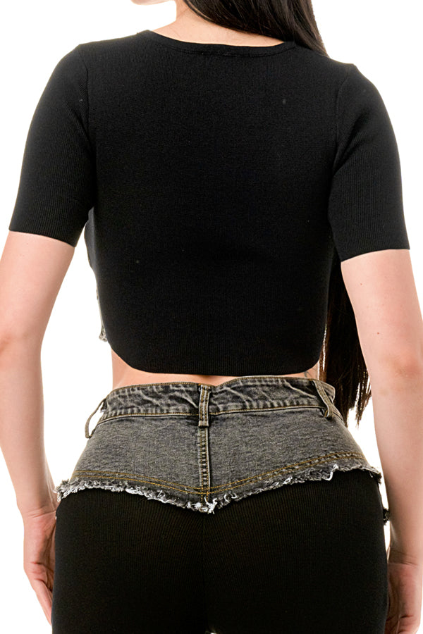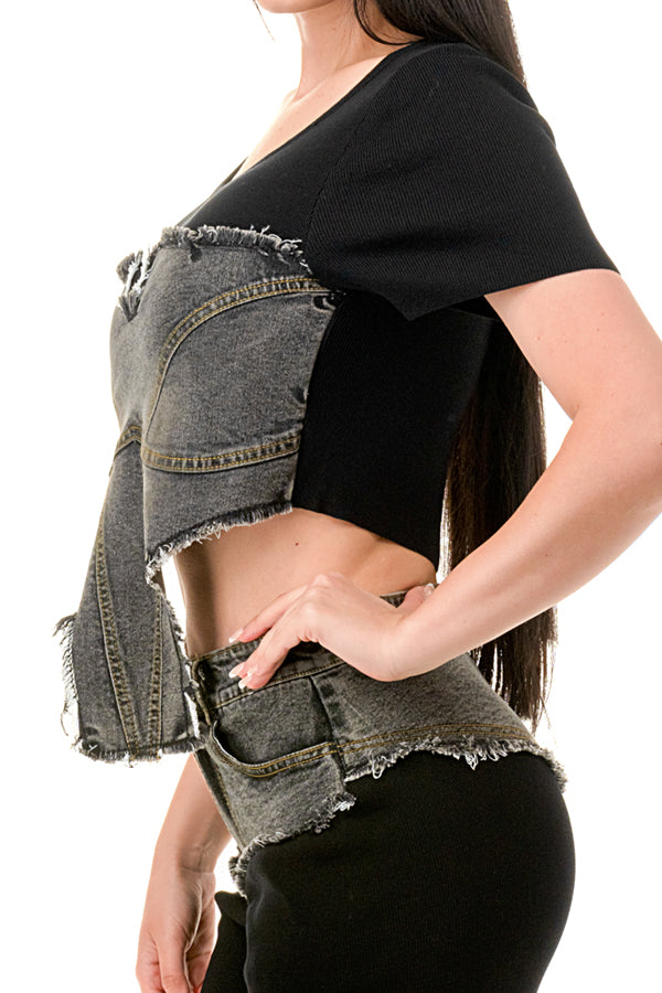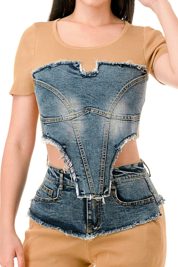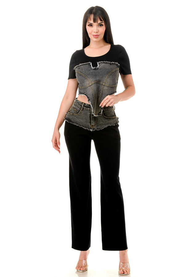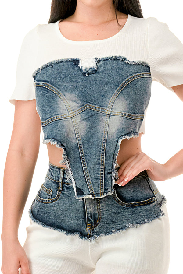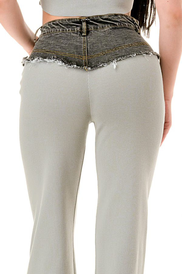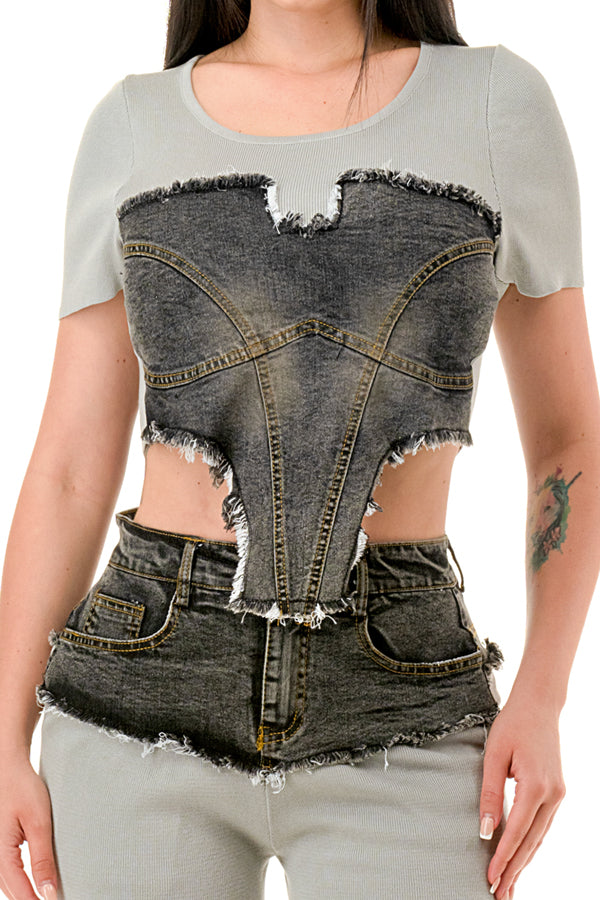 Denim Contrast Crop Top and Pants Set