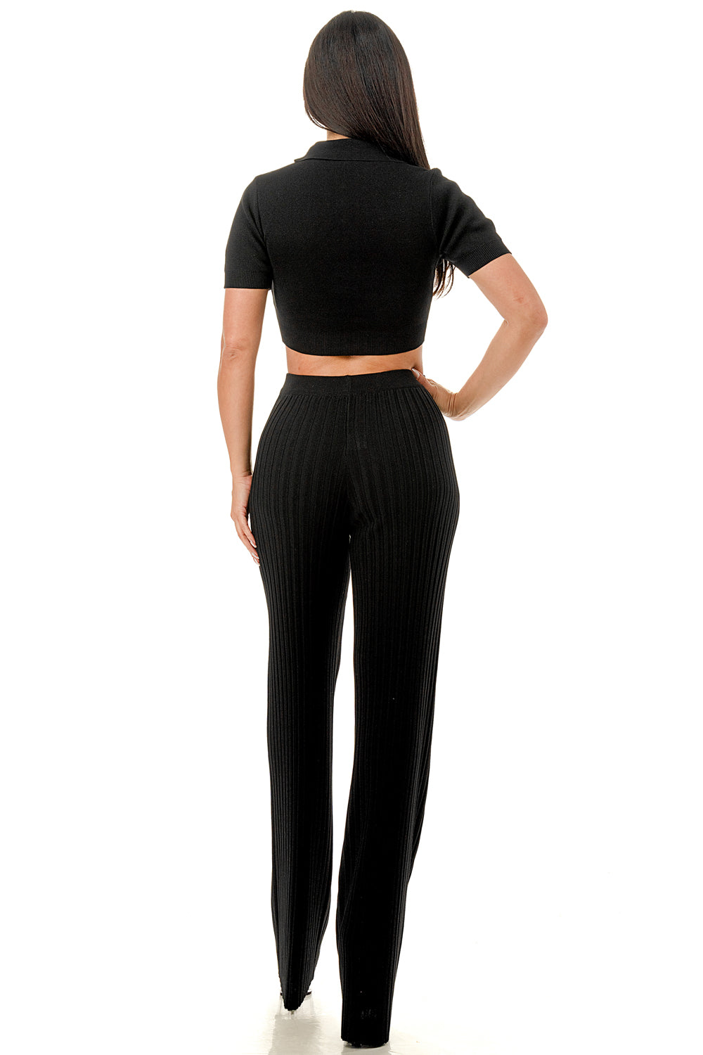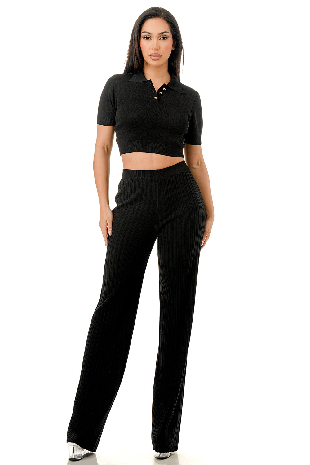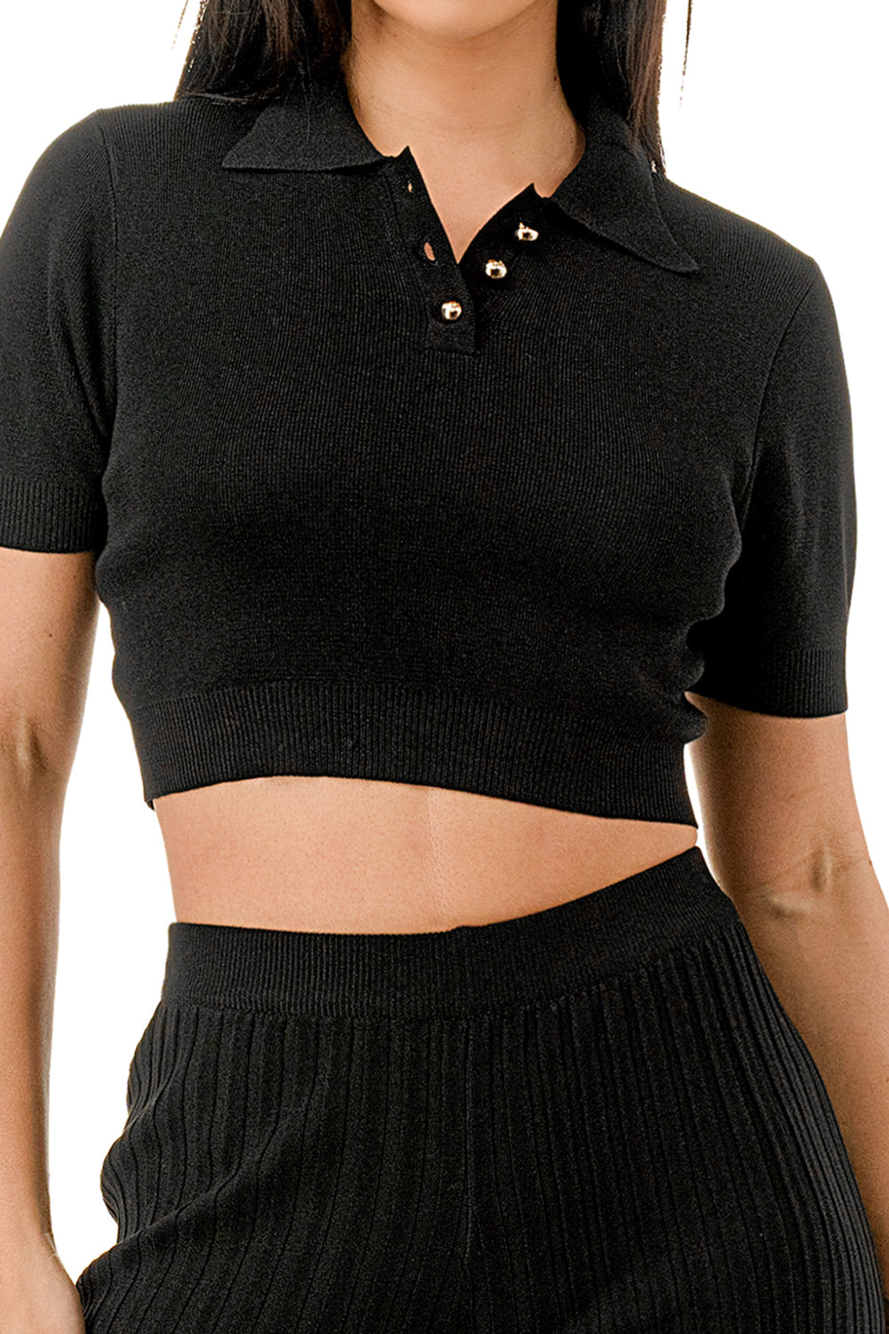 Short sleeve matching lounge set with gold accent button closure on collared top. Matching color ribbed knit pants set.