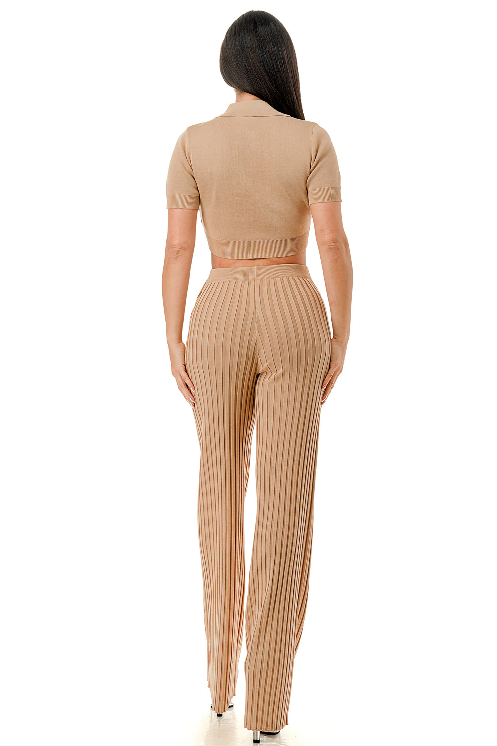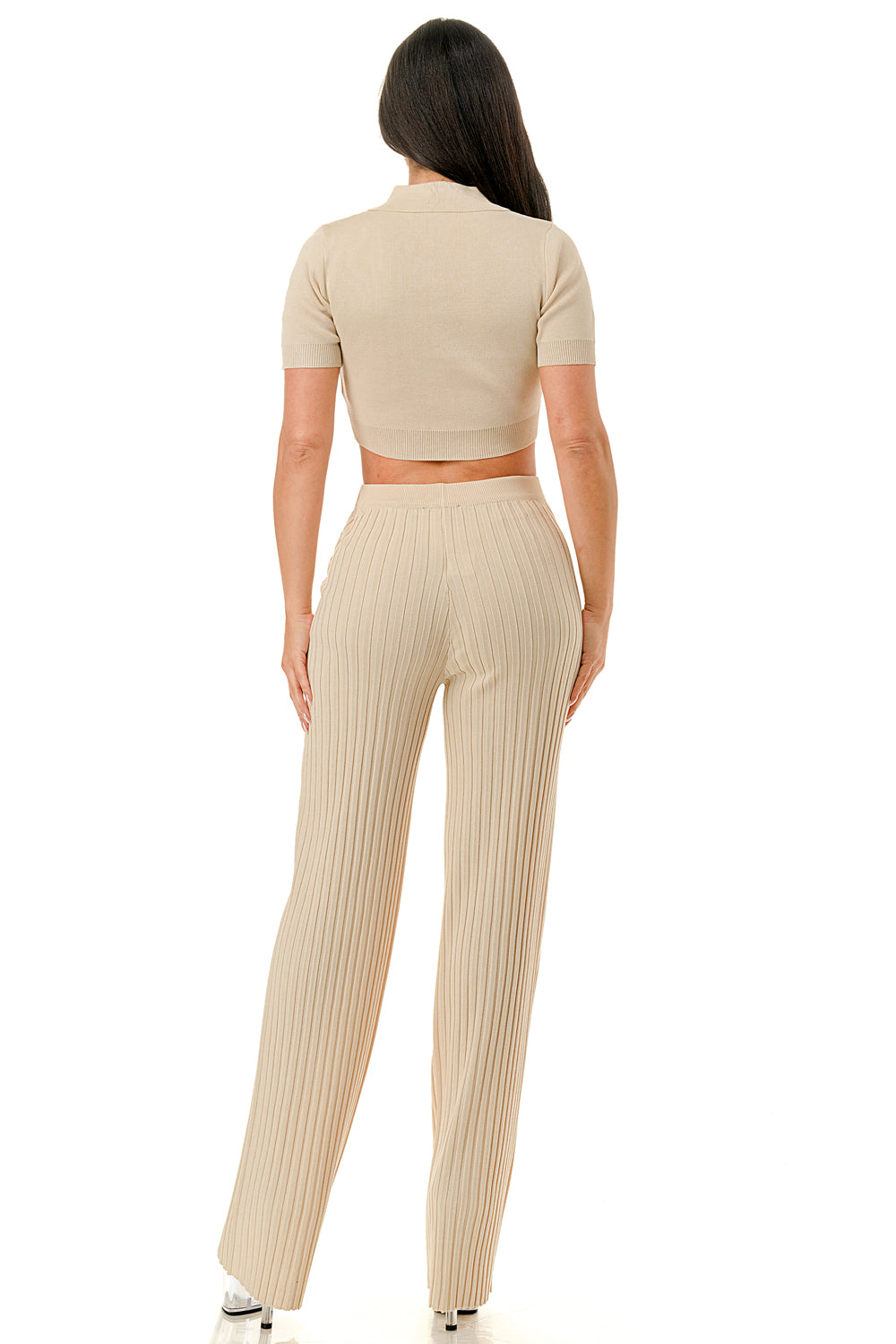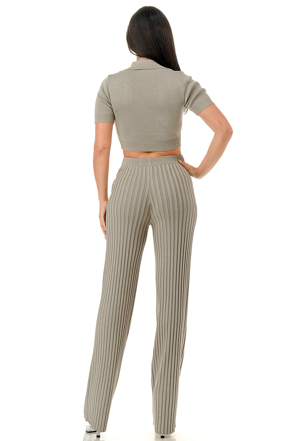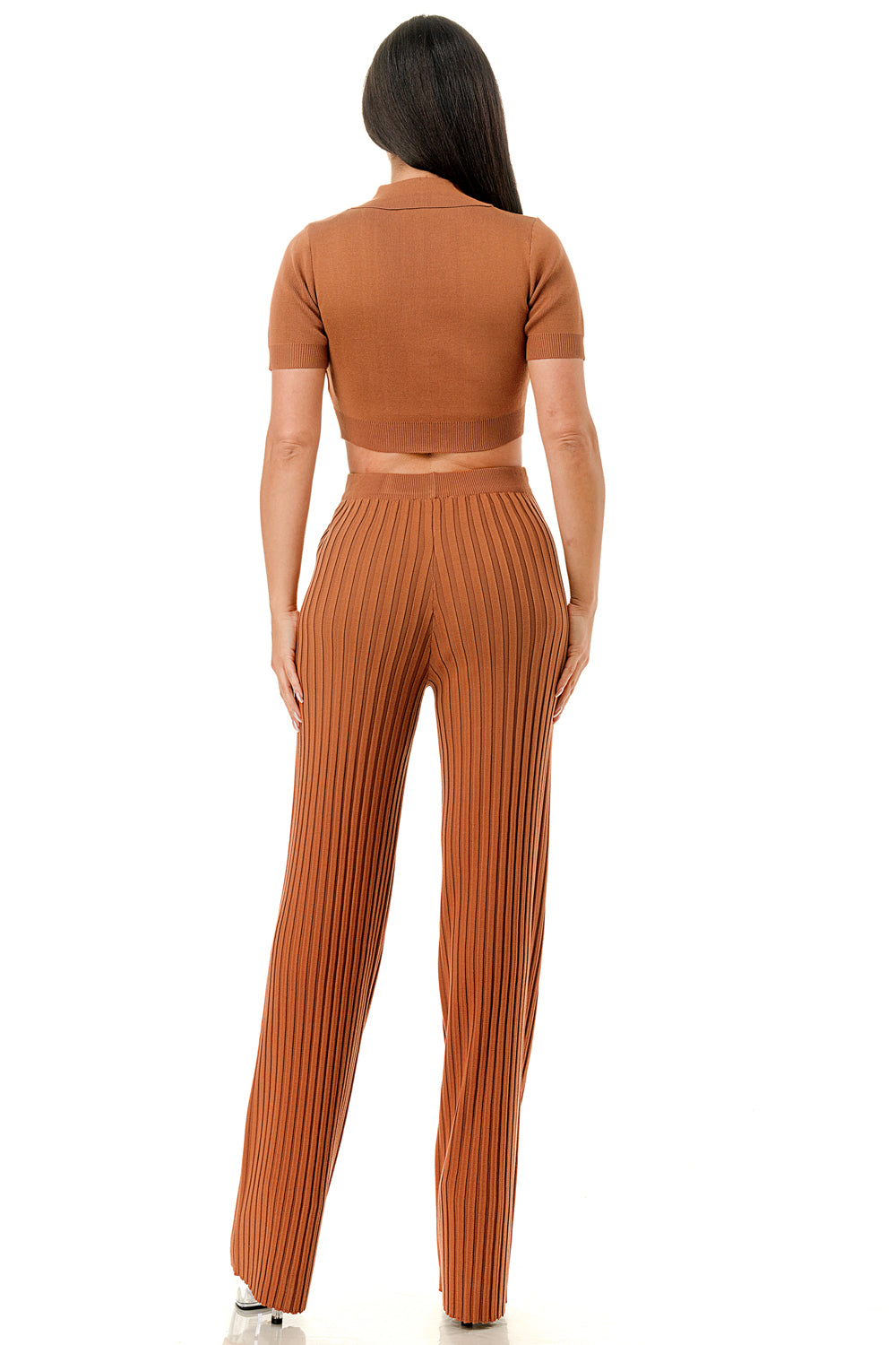 Short sleeve matching lounge set with gold accent button closure on collared top. Matching color ribbed knit pants set.