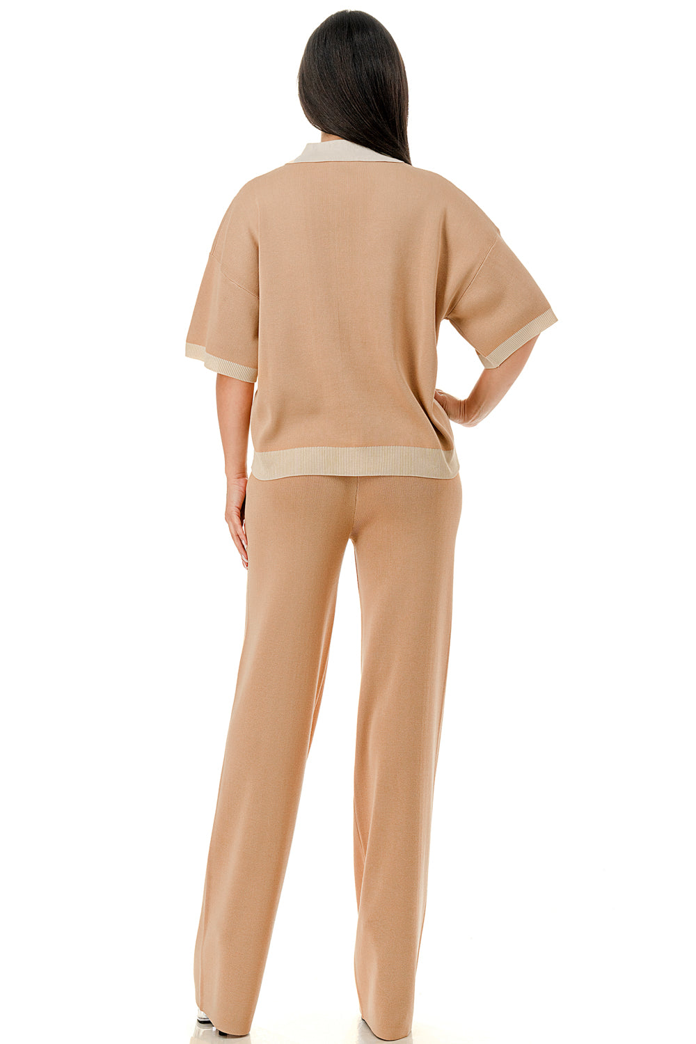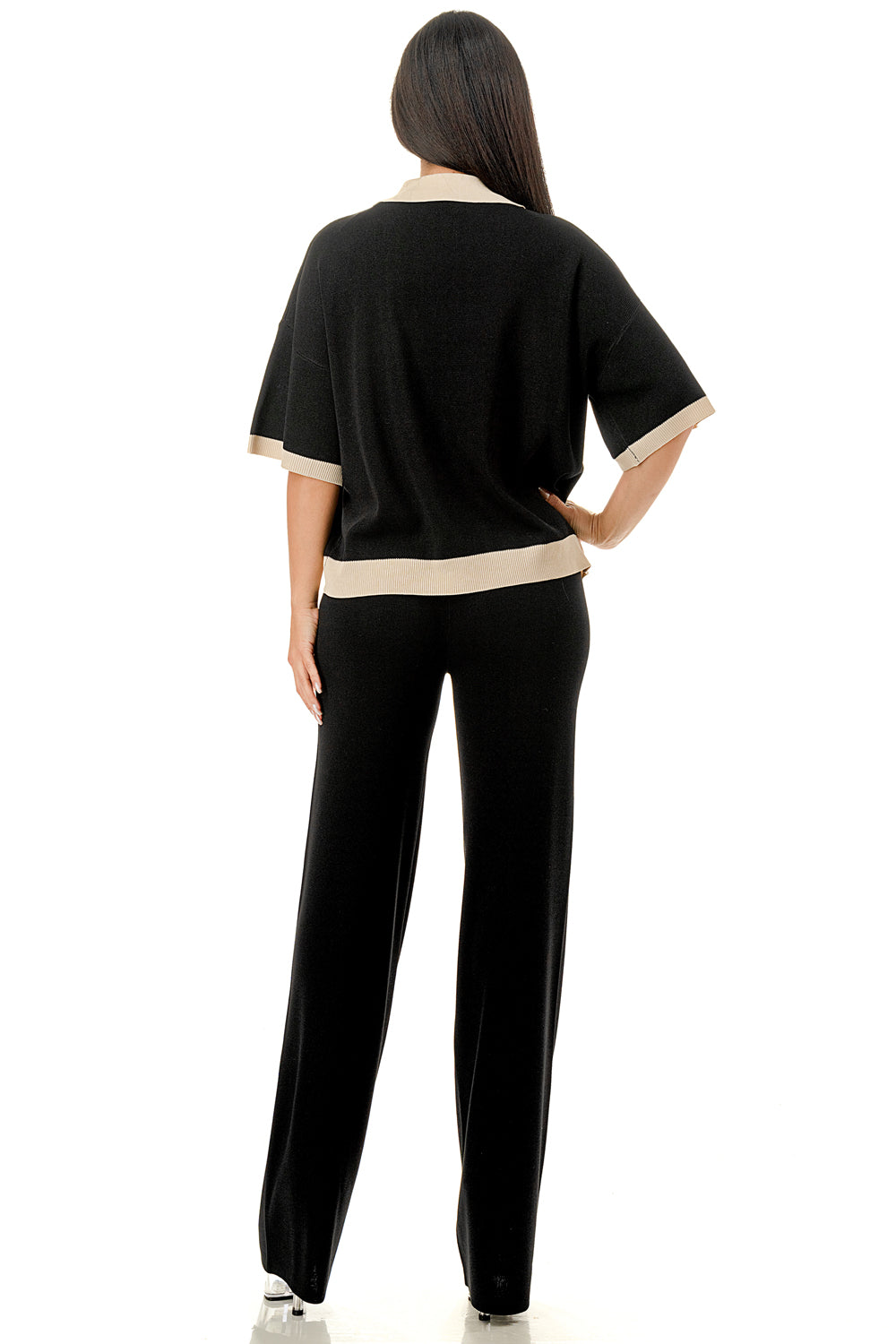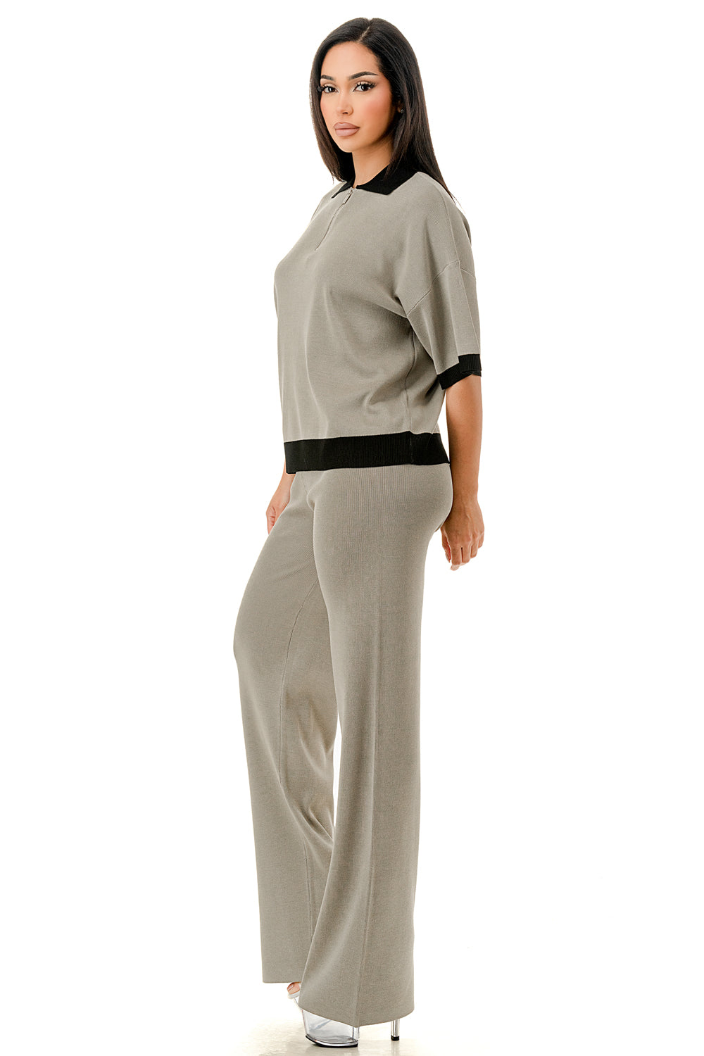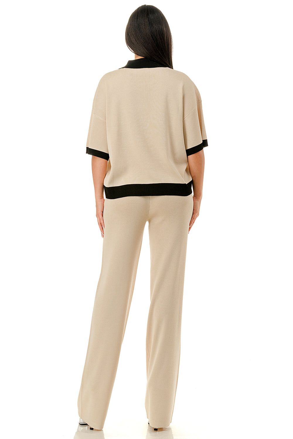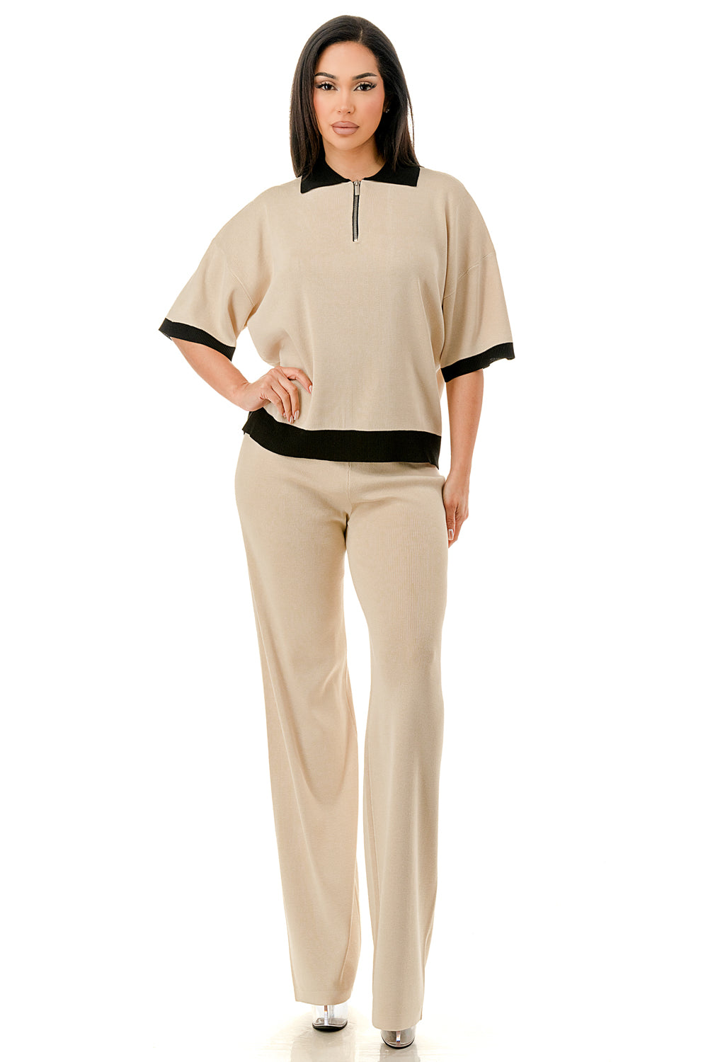 Collared 1/4 zip top with color accents at the collar, sleeves, and hem. Matching solid colored pants.
