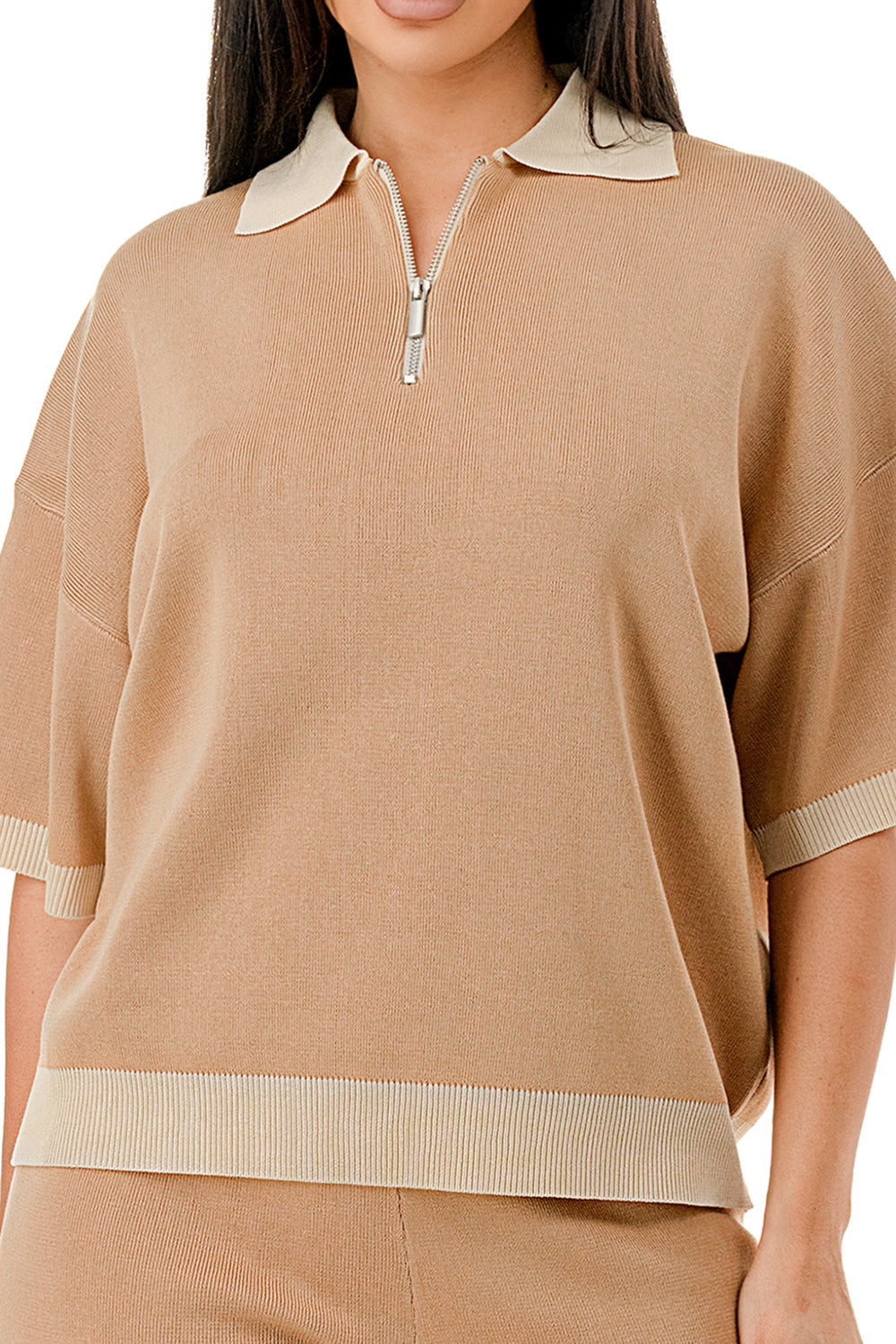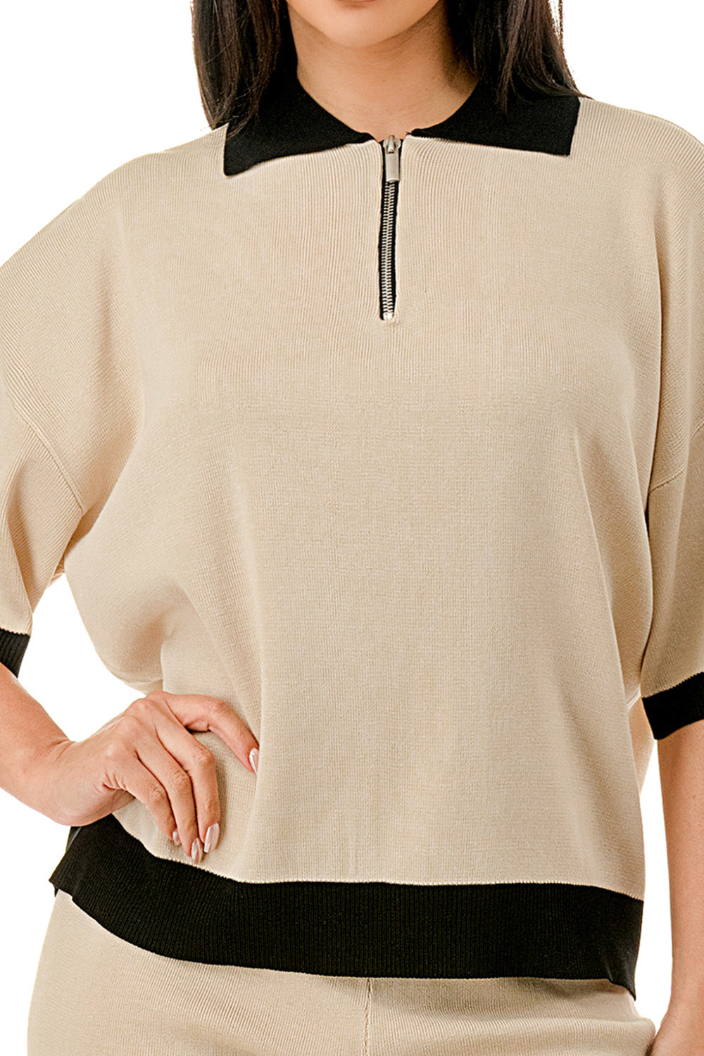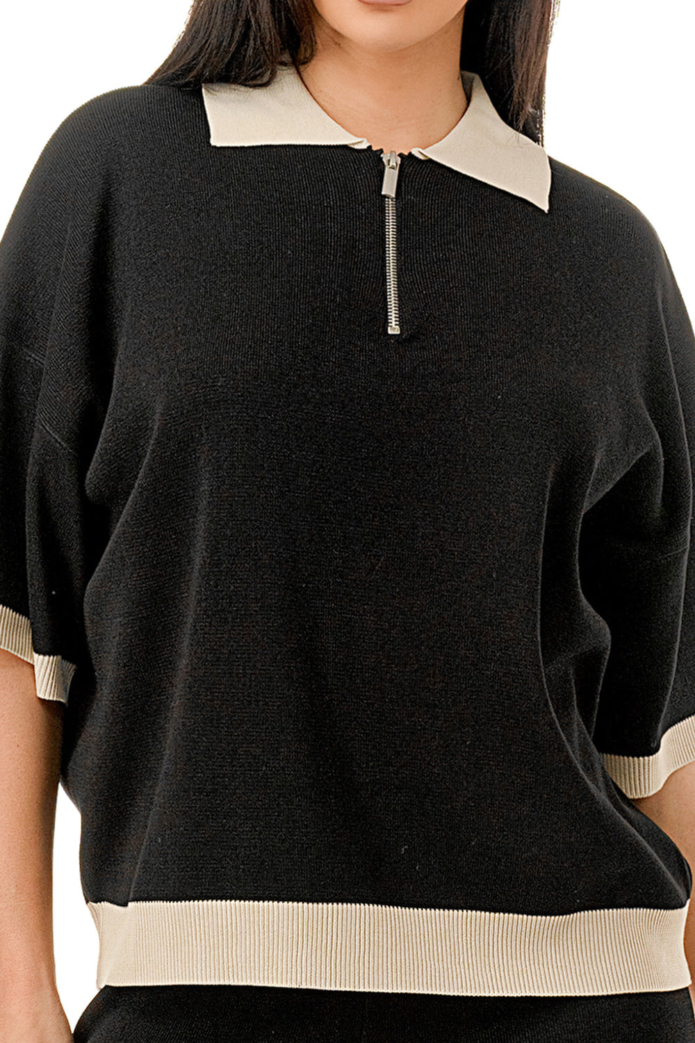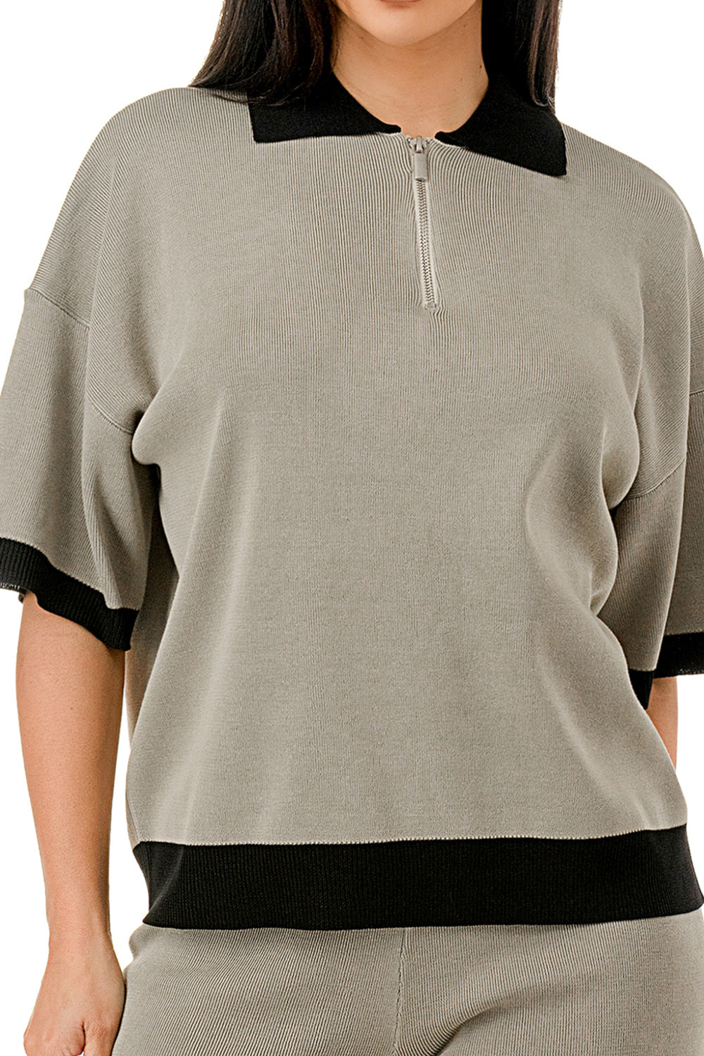 Collared 1/4 zip top with color accents at the collar, sleeves, and hem. Matching solid colored pants.