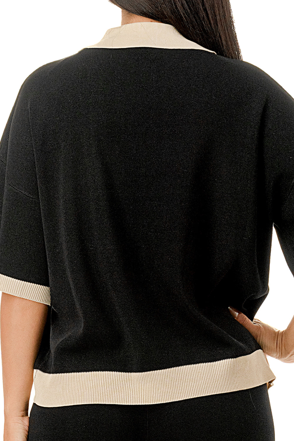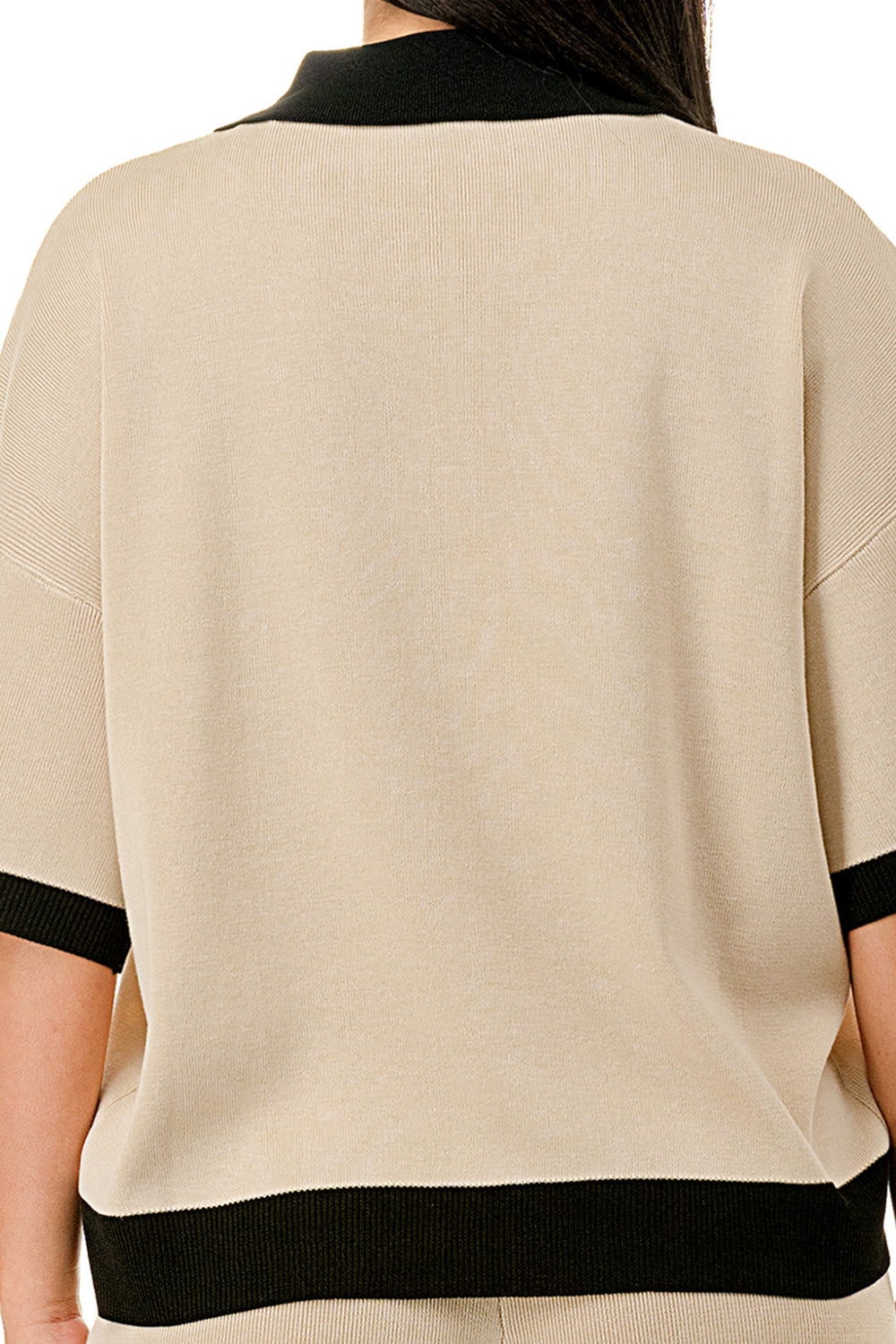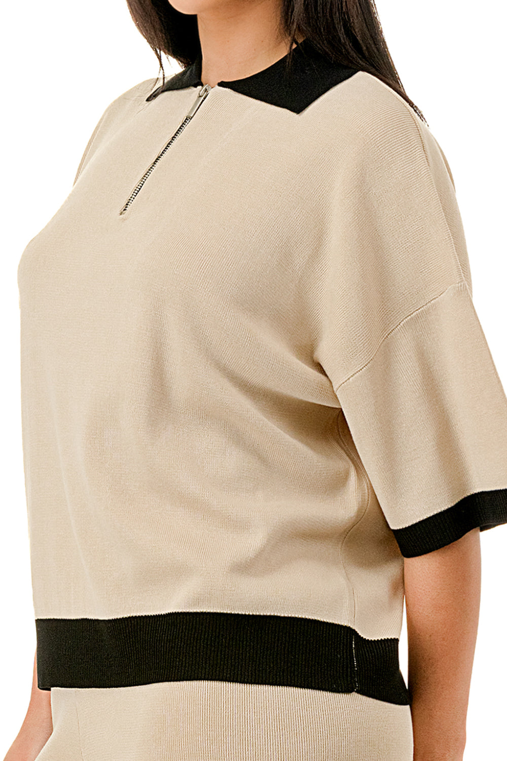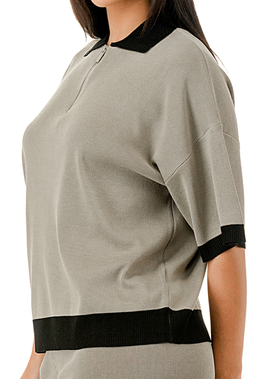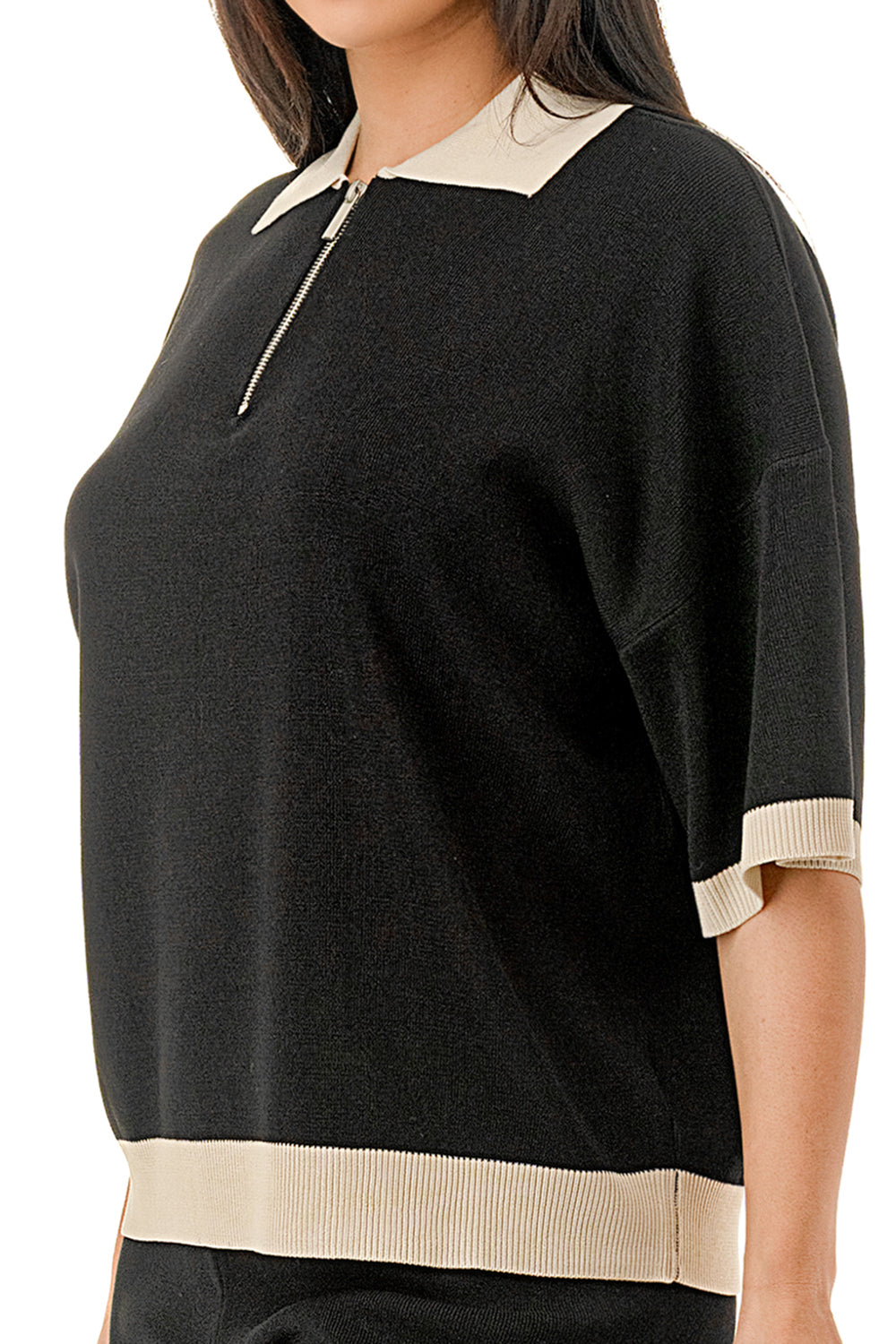 Collared 1/4 zip top with color accents at the collar, sleeves, and hem. Matching solid colored pants.