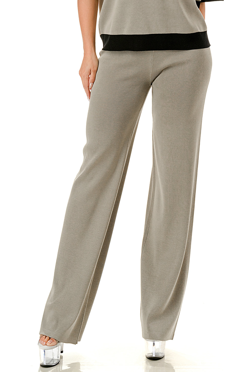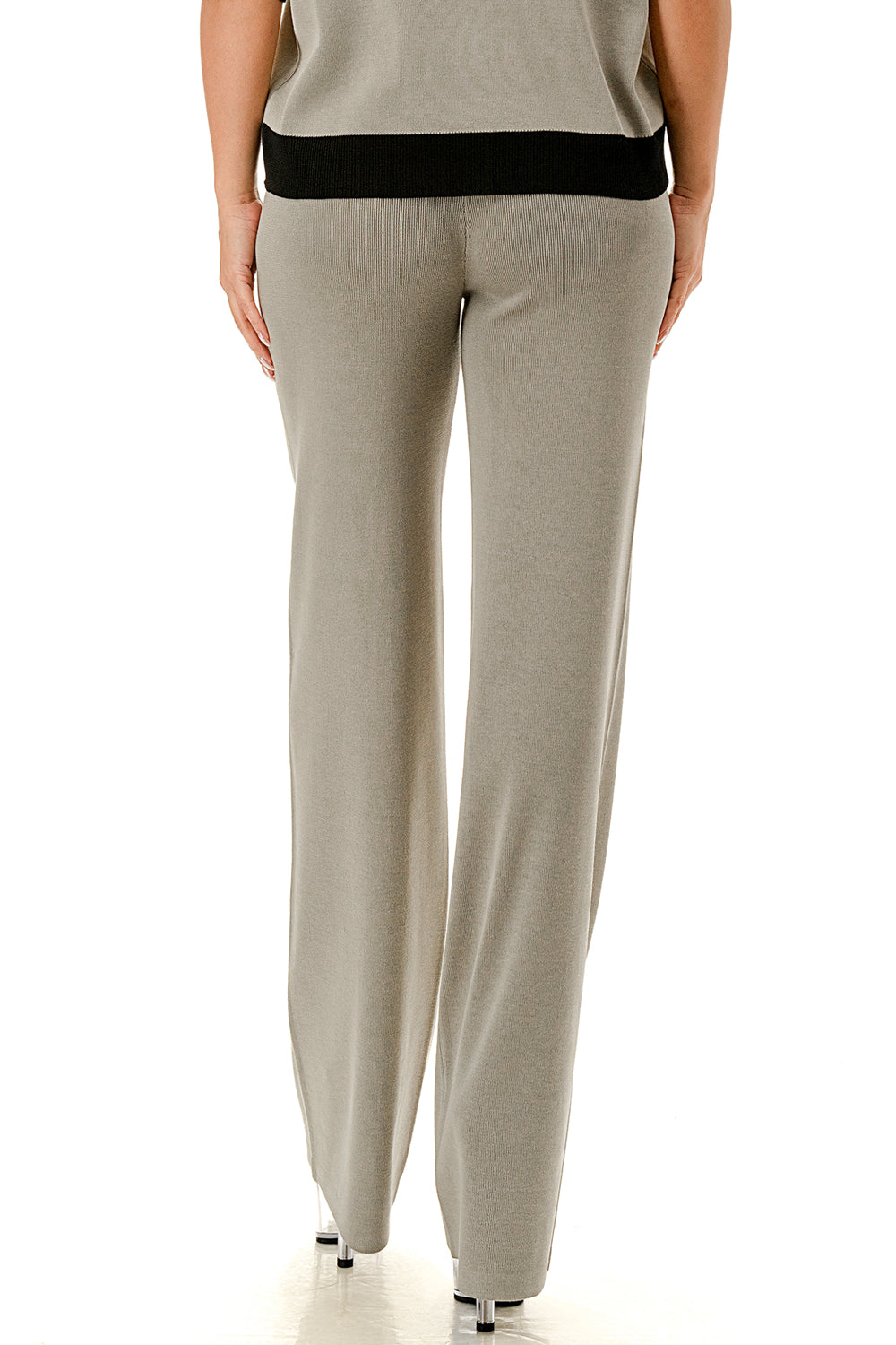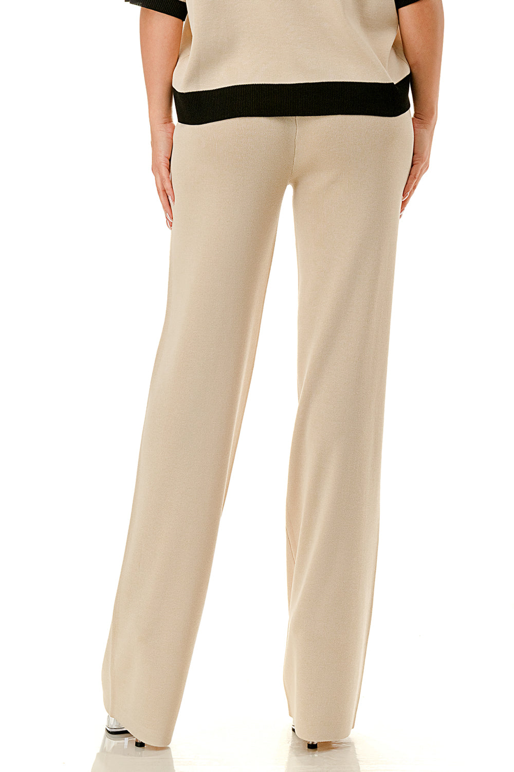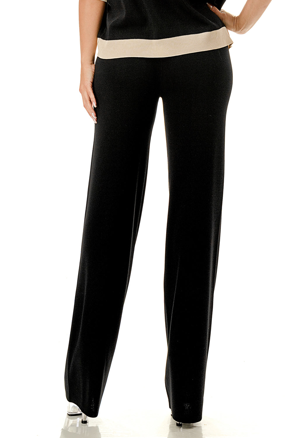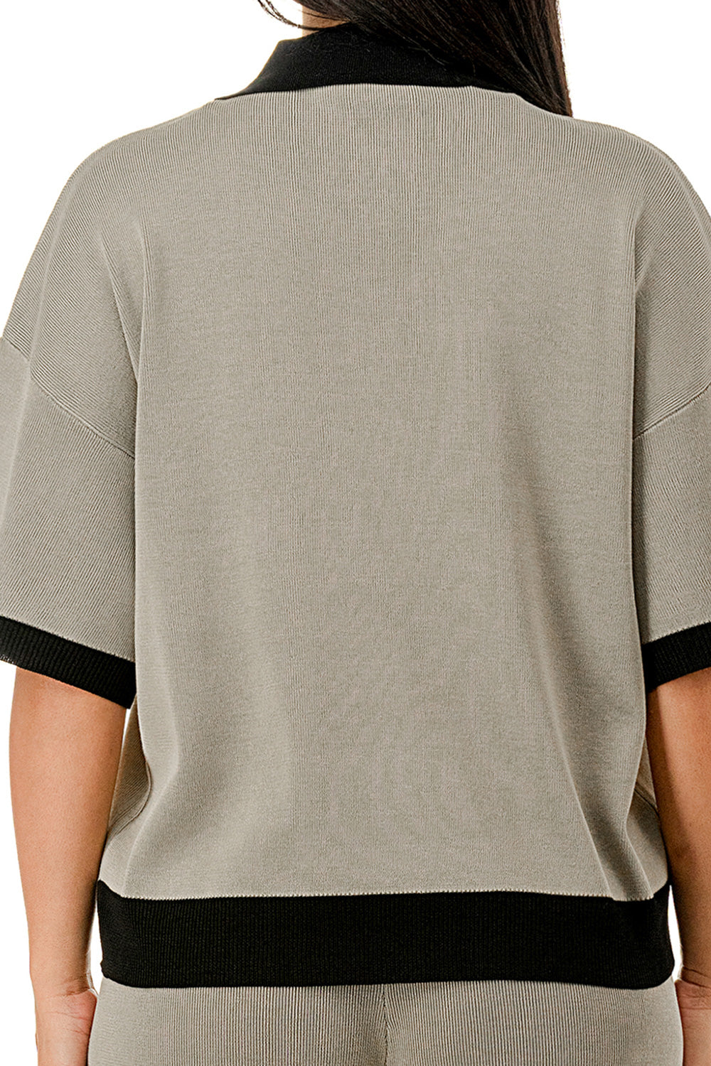 Collared 1/4 zip top with color accents at the collar, sleeves, and hem. Matching solid colored pants.