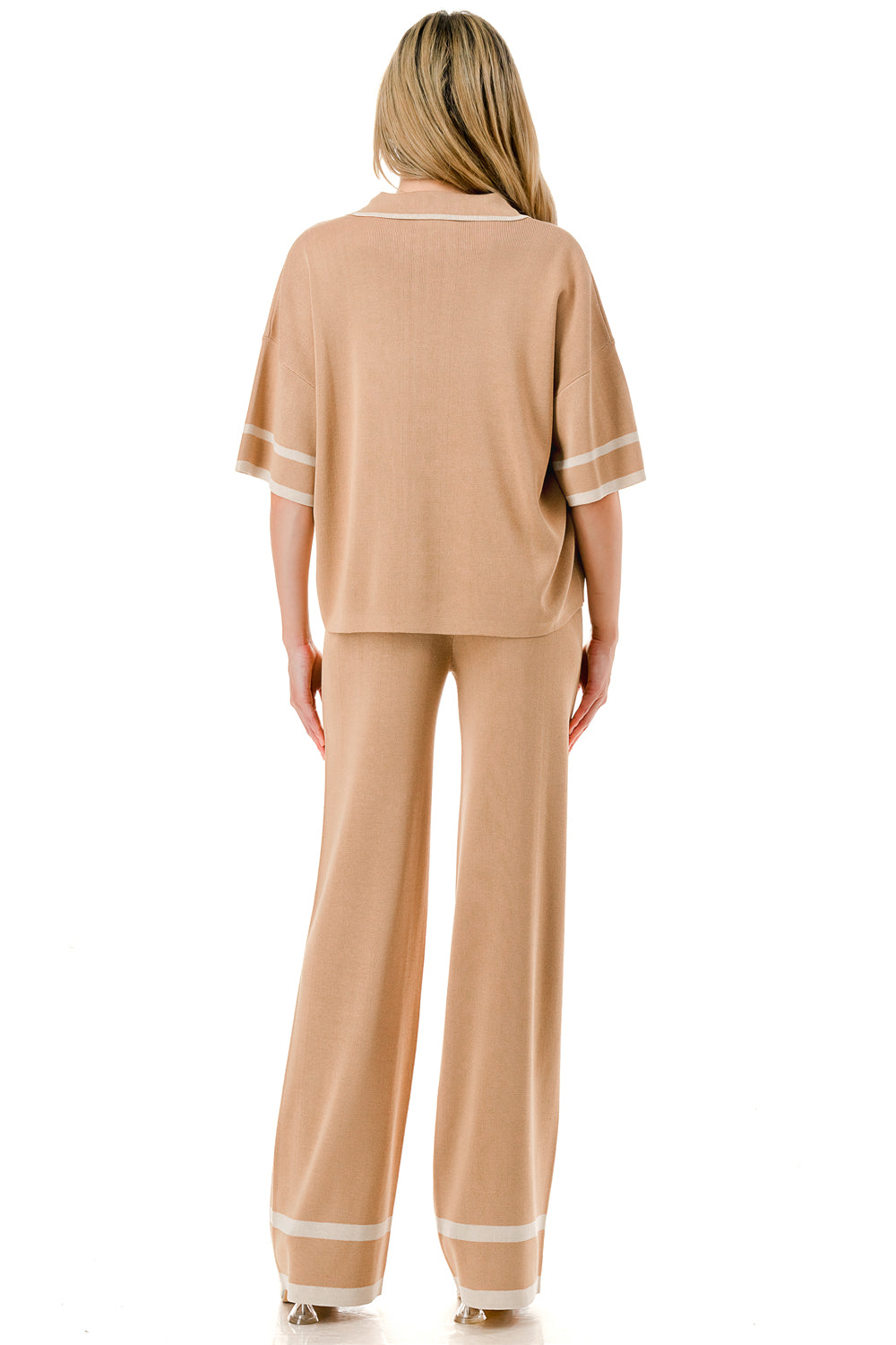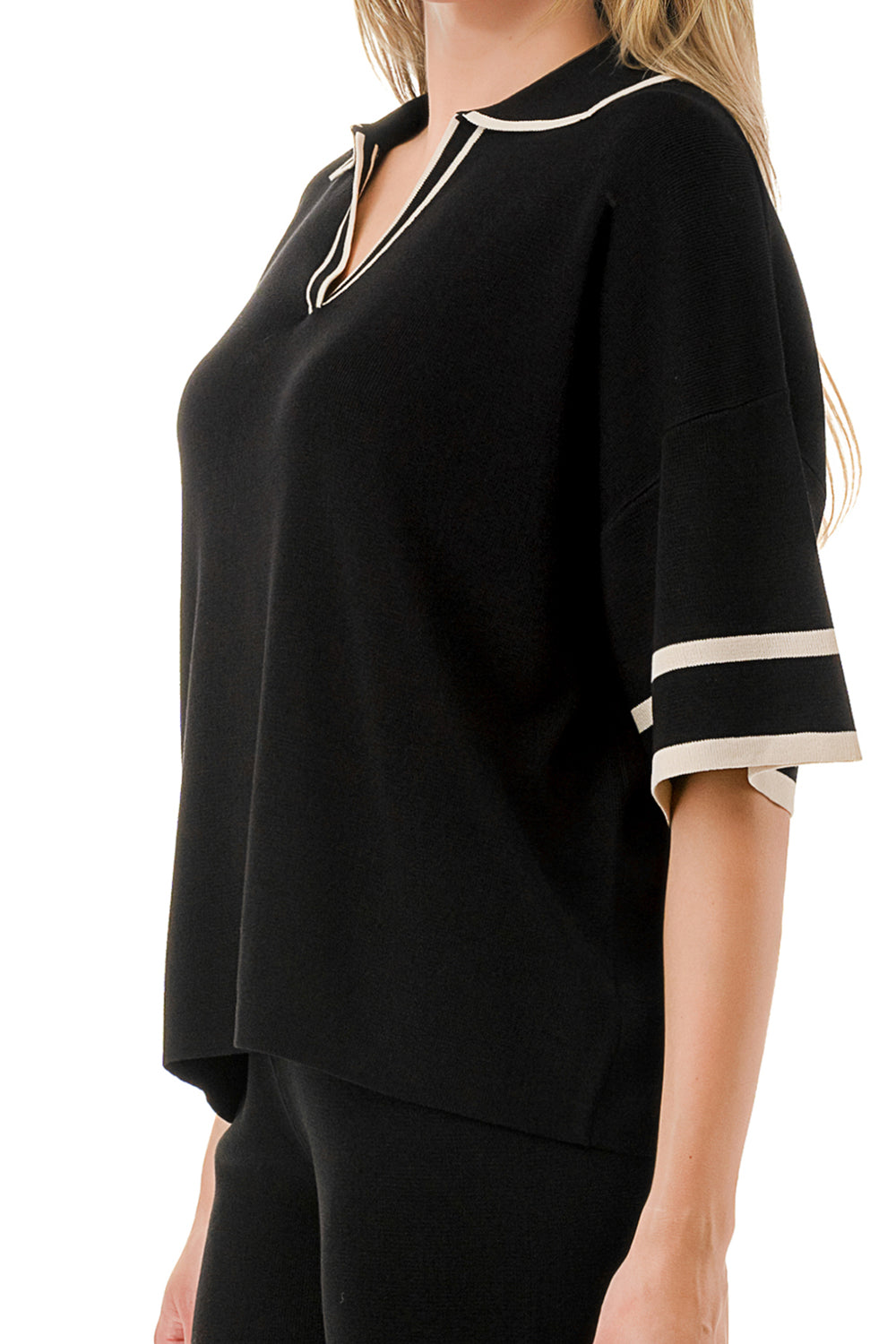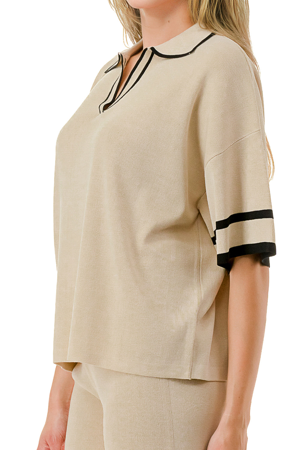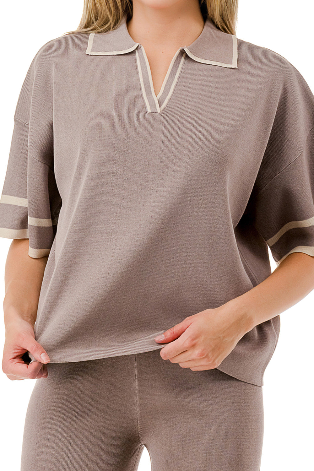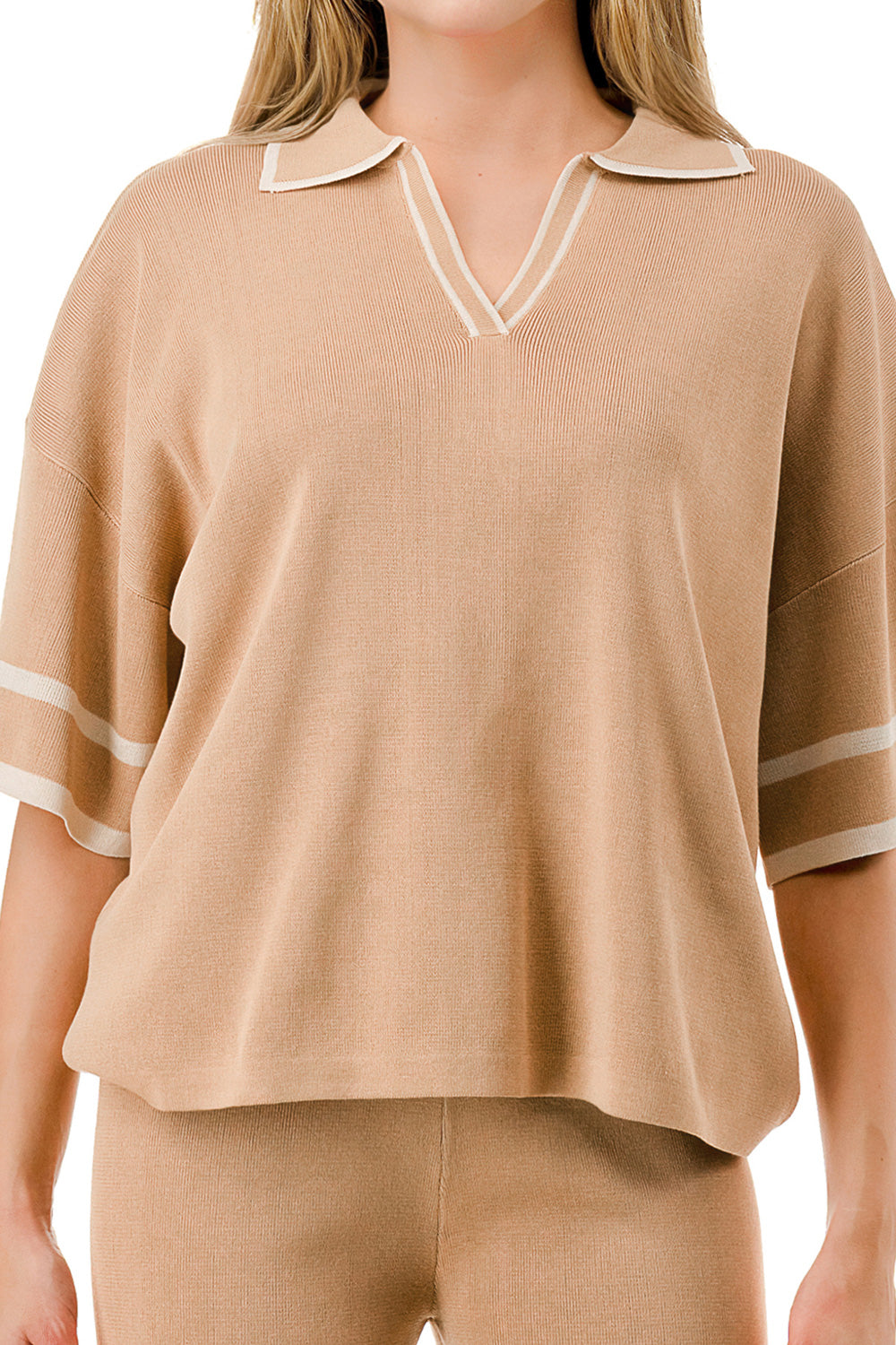 Short sleeve loose fit knit matching set. Collared top with V-neck and stripe accent. Matching pants with strip accent.