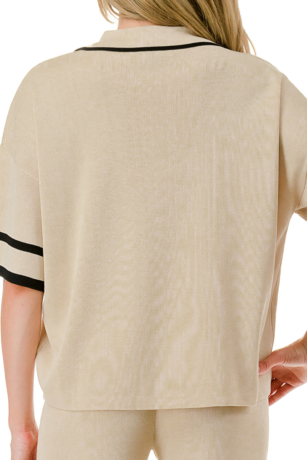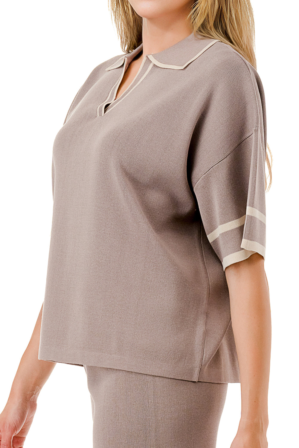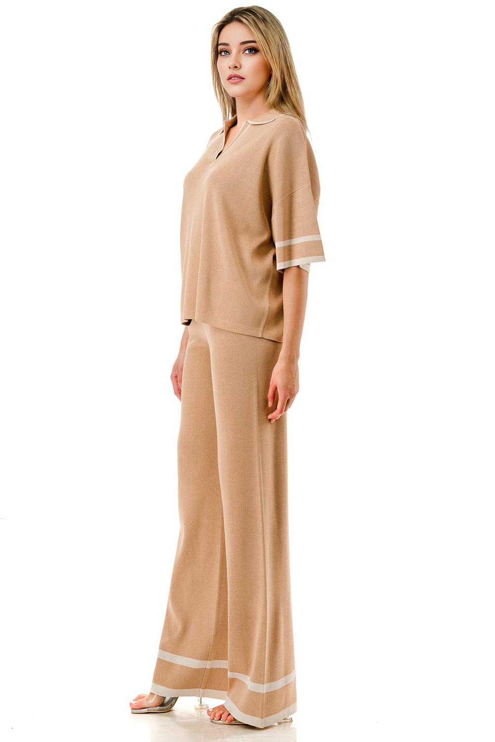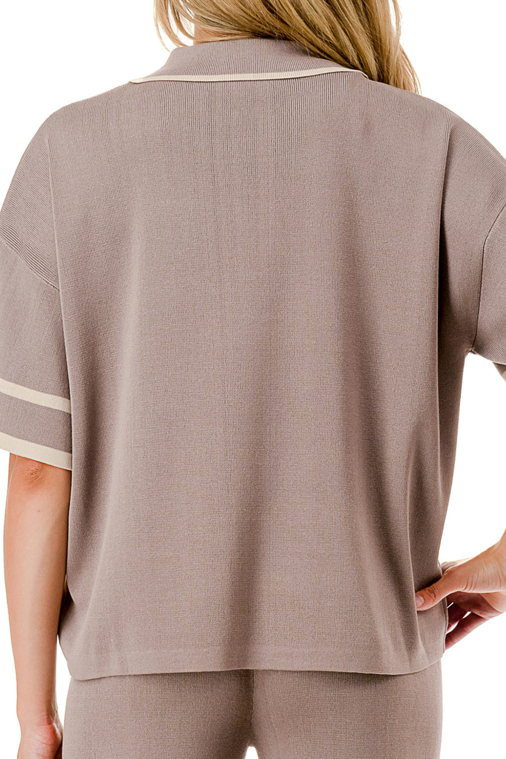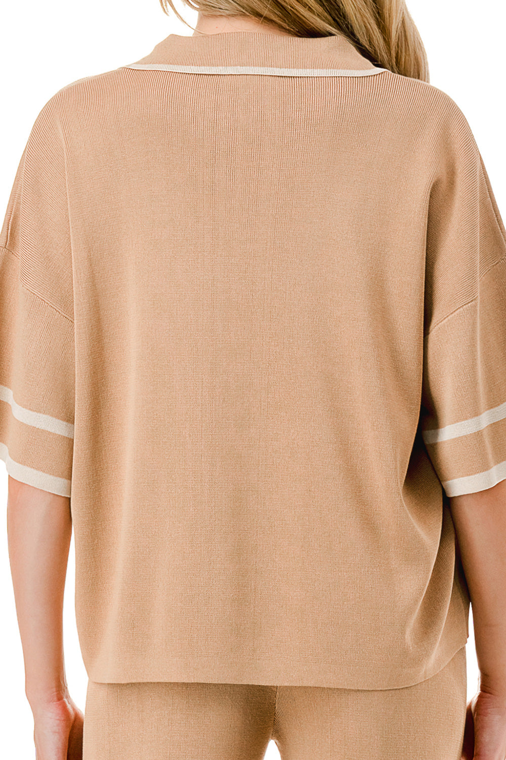 Short sleeve loose fit knit matching set. Collared top with V-neck and stripe accent. Matching pants with strip accent.