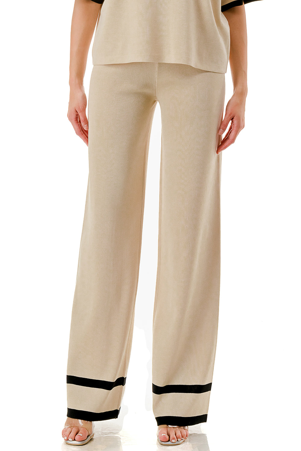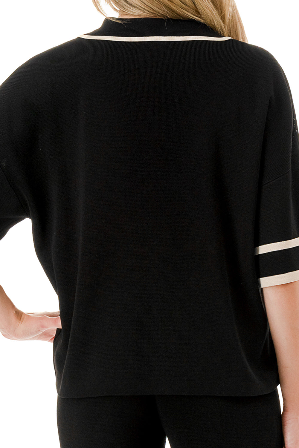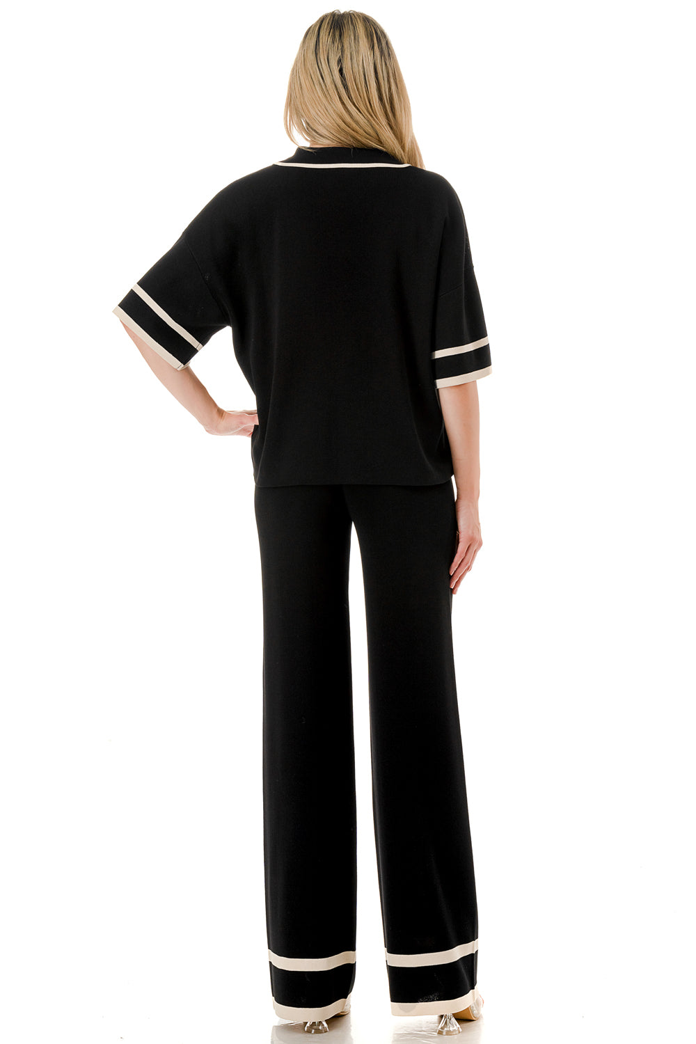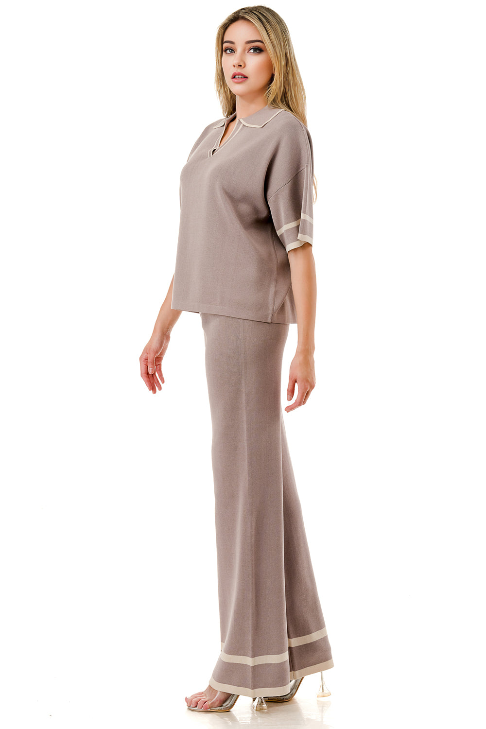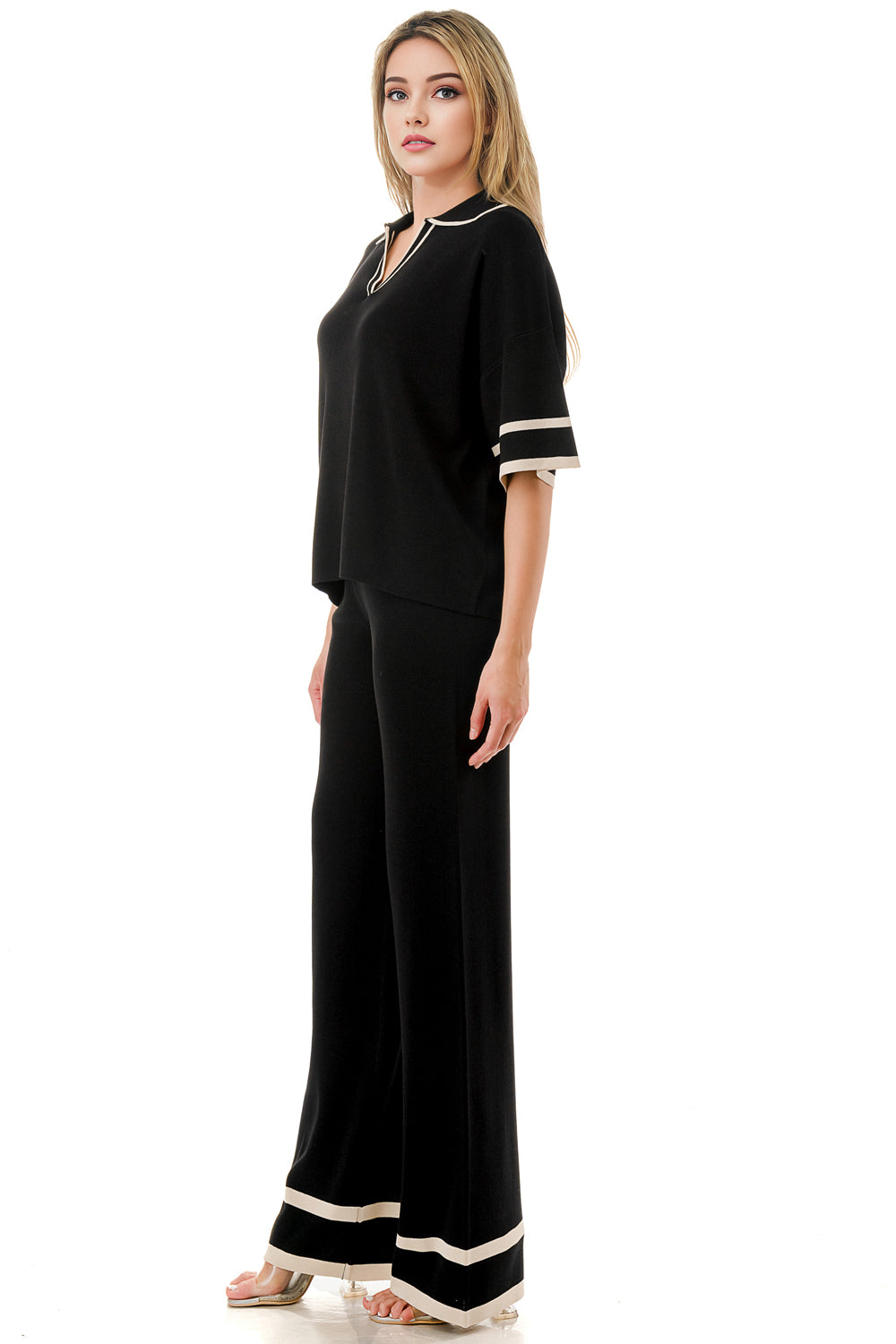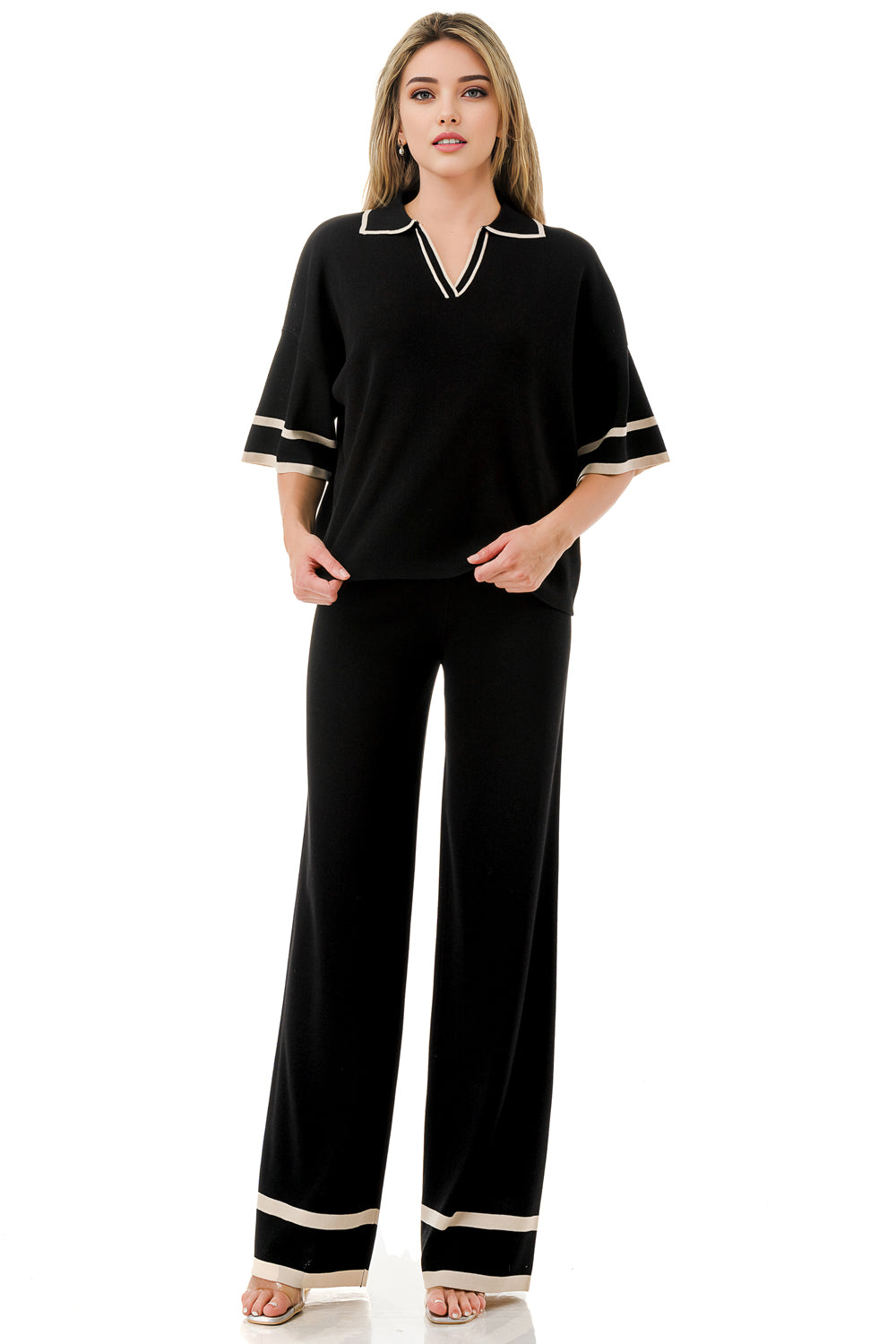 Short sleeve loose fit knit matching set. Collared top with V-neck and stripe accent. Matching pants with strip accent.