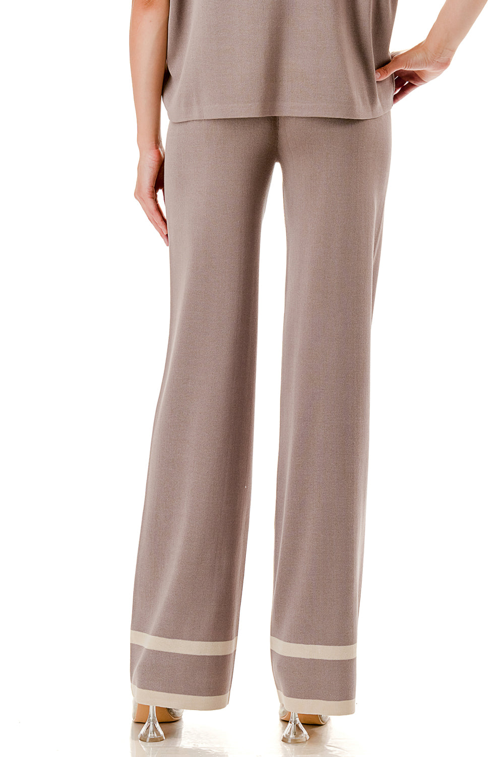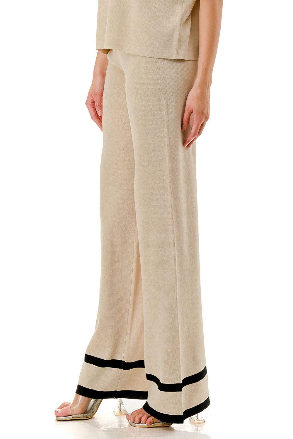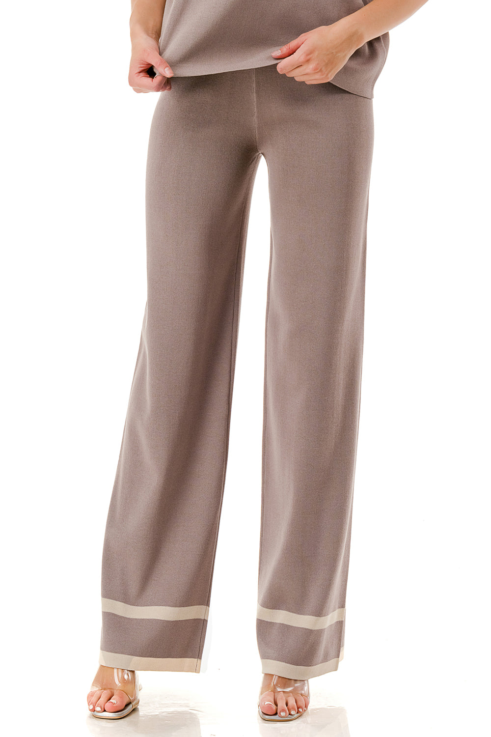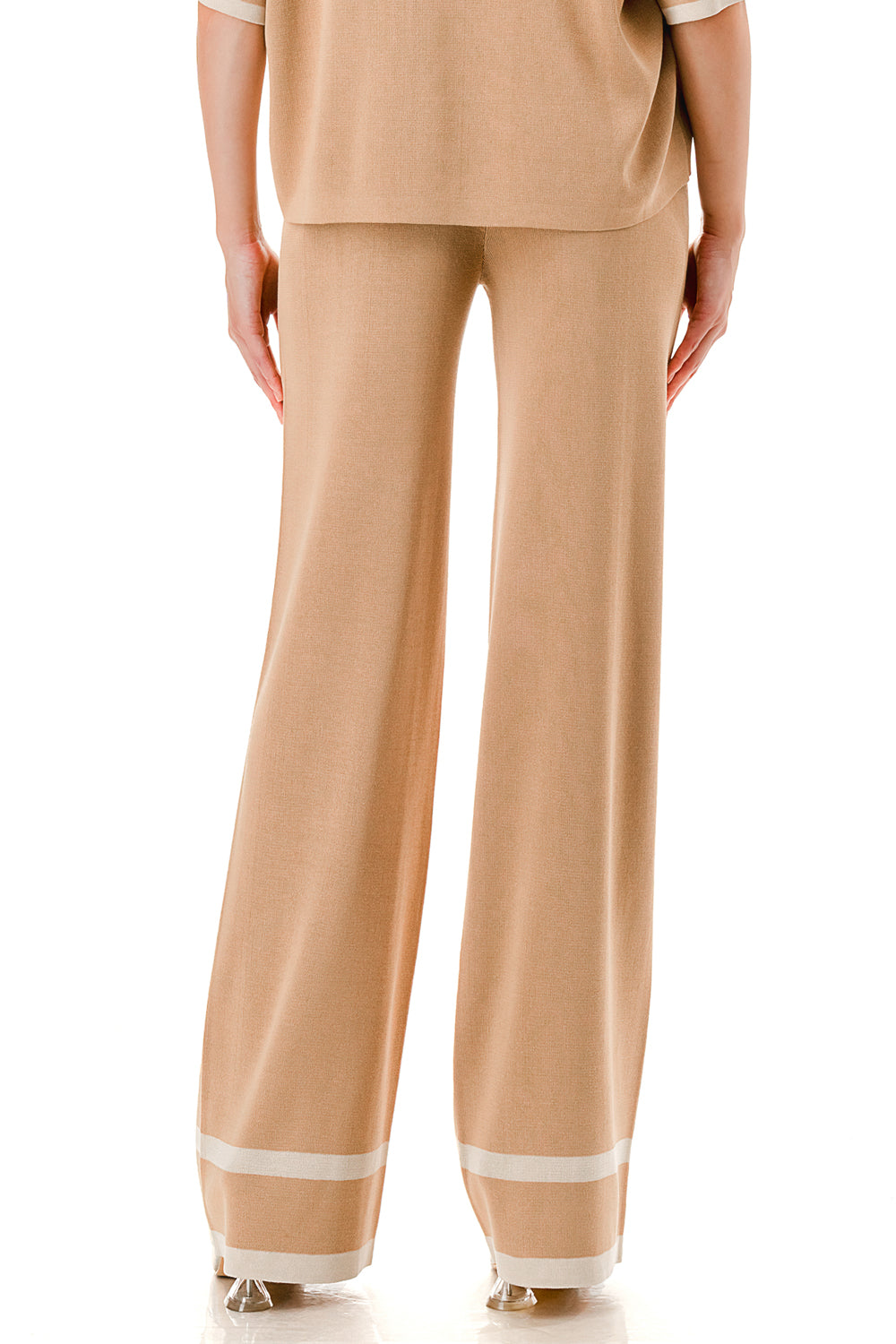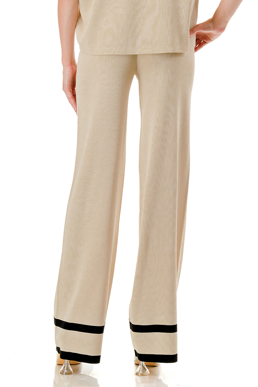 Short sleeve loose fit knit matching set. Collared top with V-neck and stripe accent. Matching pants with strip accent.