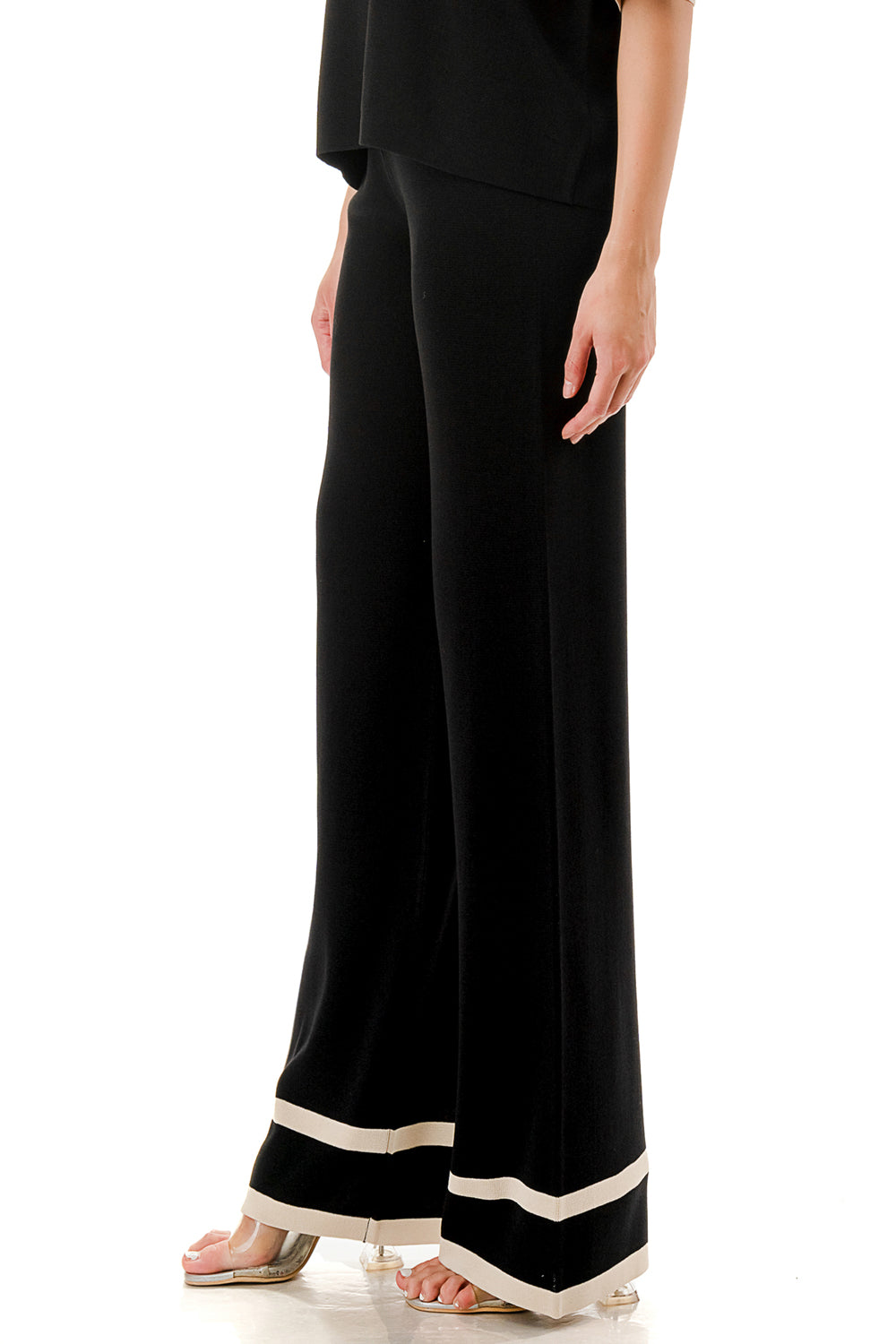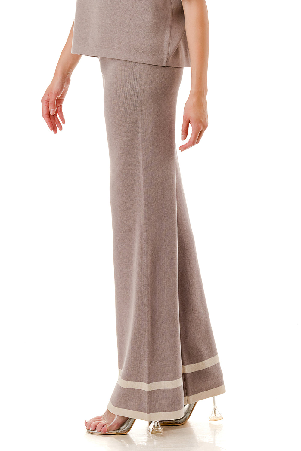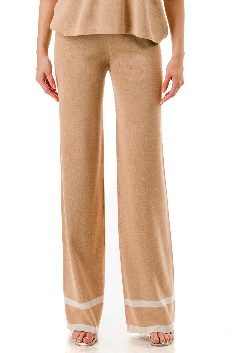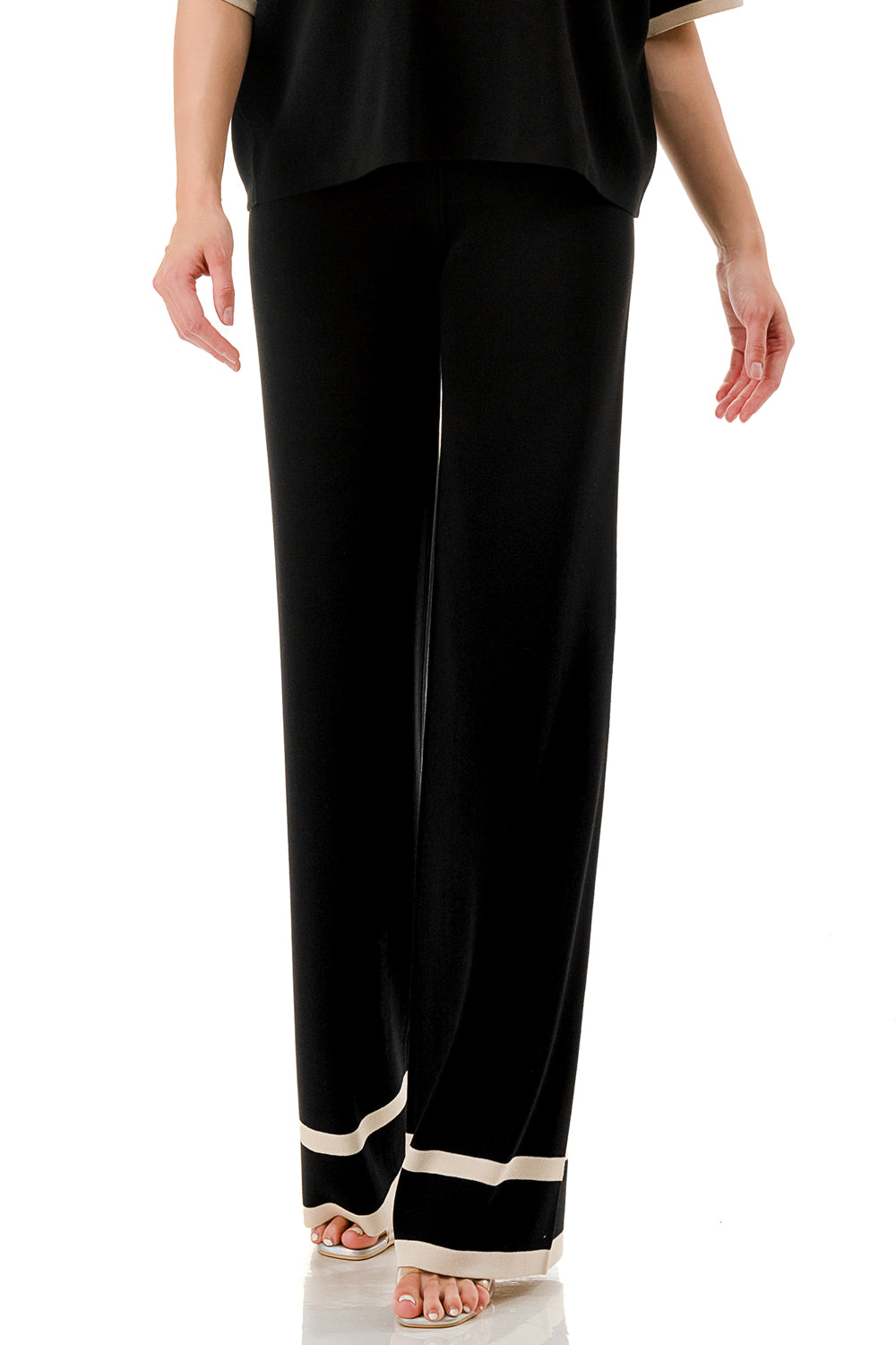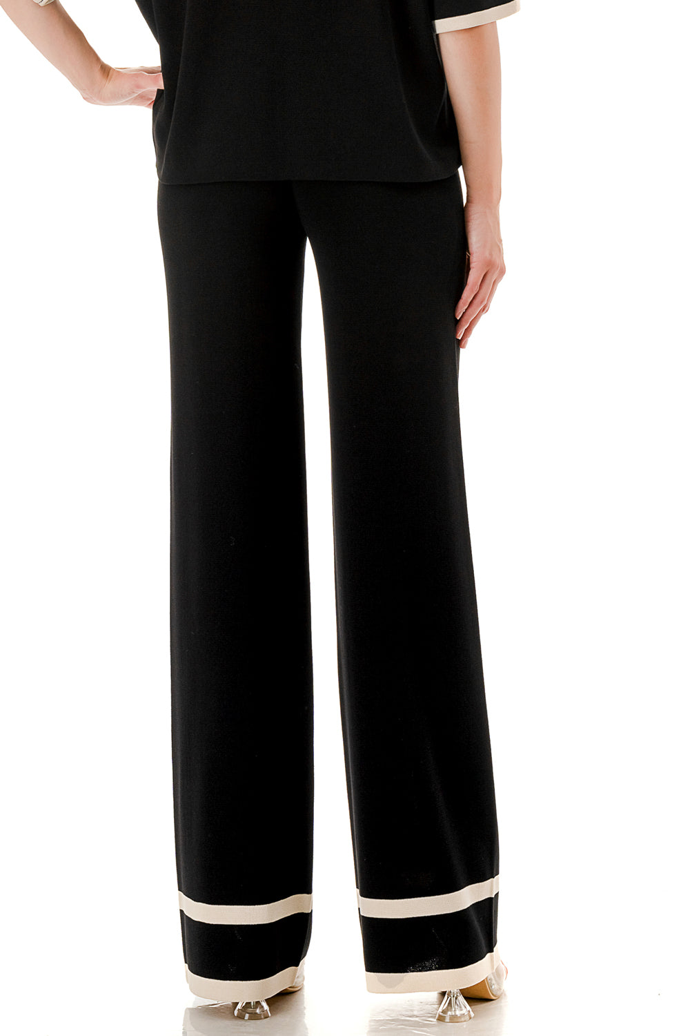 Short sleeve loose fit knit matching set. Collared top with V-neck and stripe accent. Matching pants with strip accent.