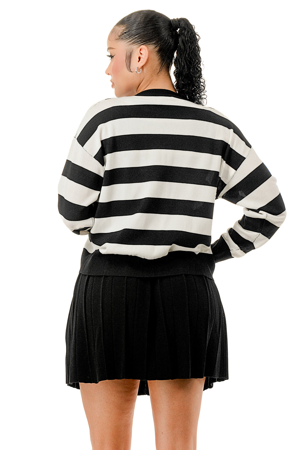 University girl 3 piece skirt set. Striped cardagin with embroided emblem patch. Matching tank top stripe with solid color pleated skirt set.