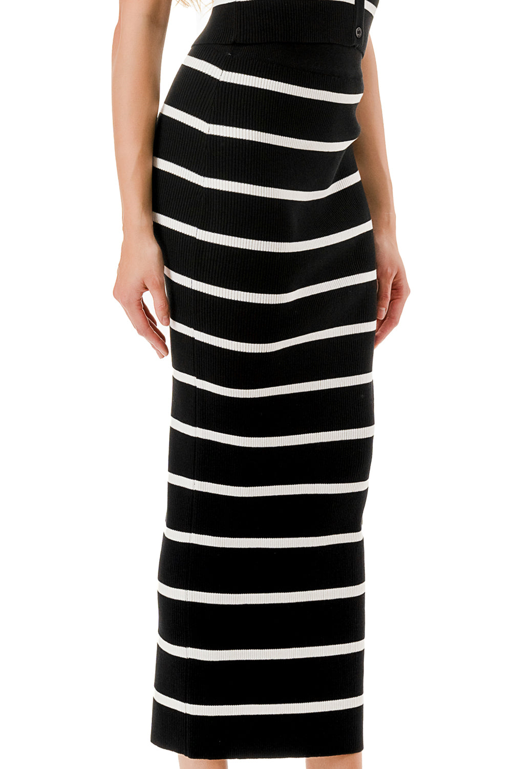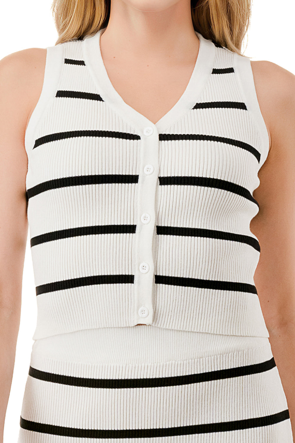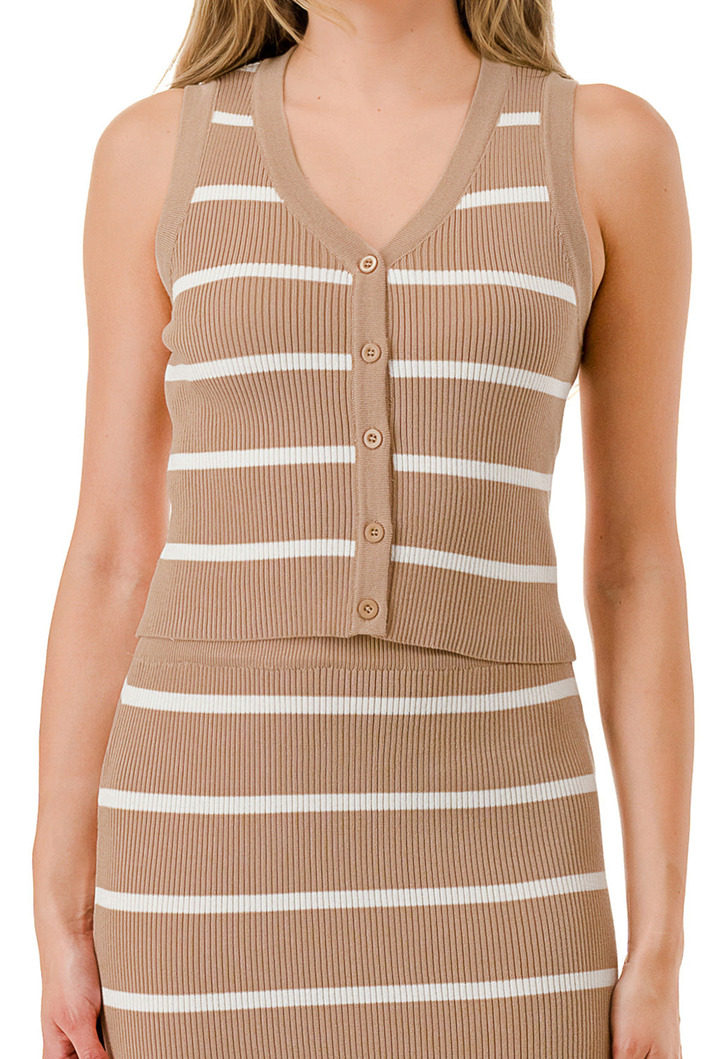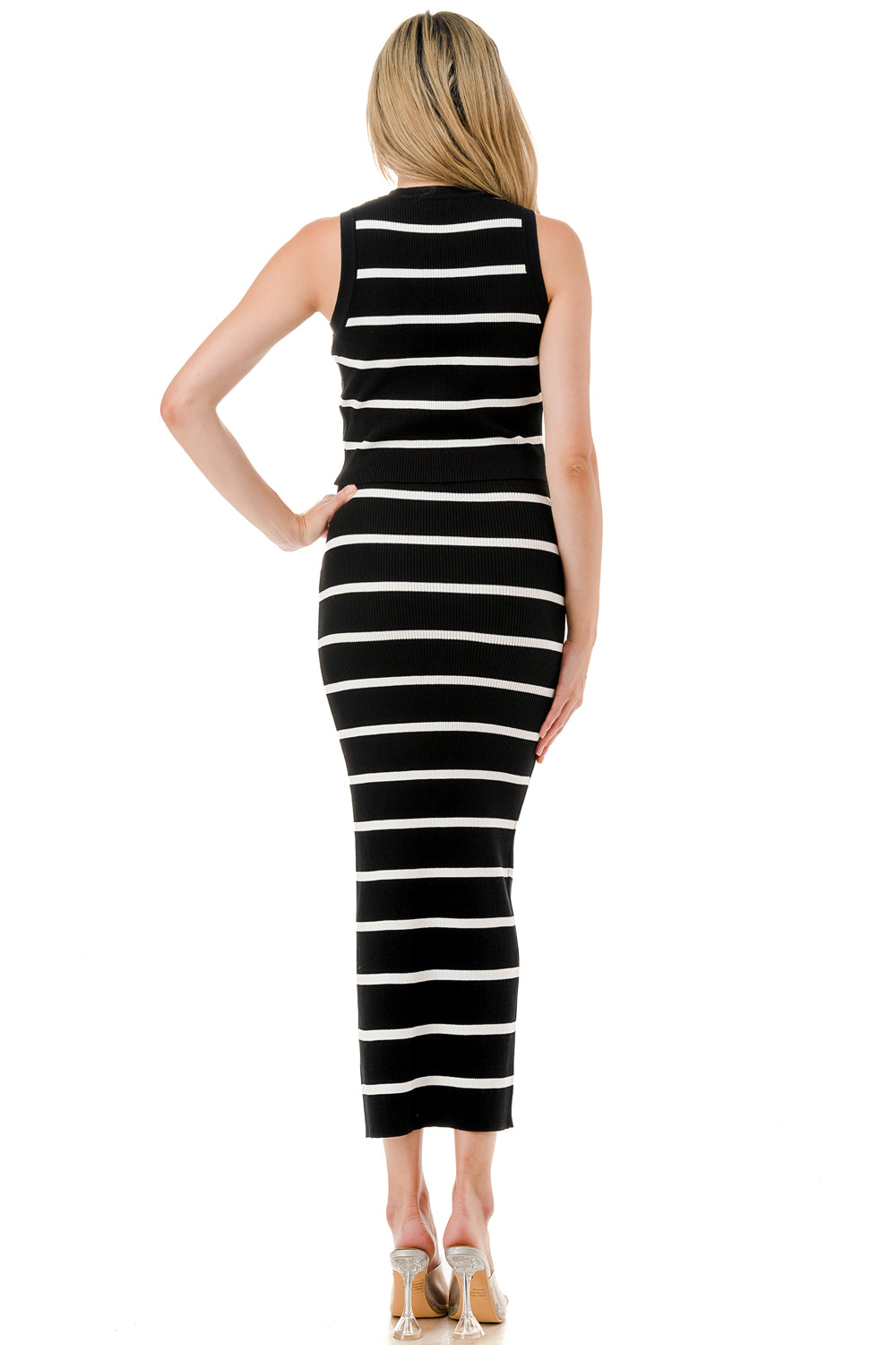 Sleeveless vest style midi skirt set. Stripped top with button closure and matching strip midi skirt.