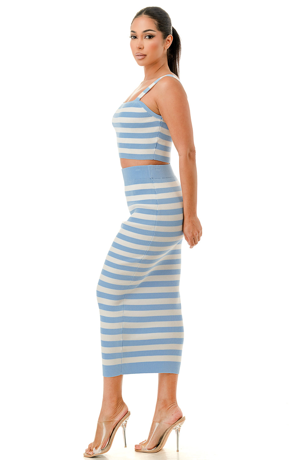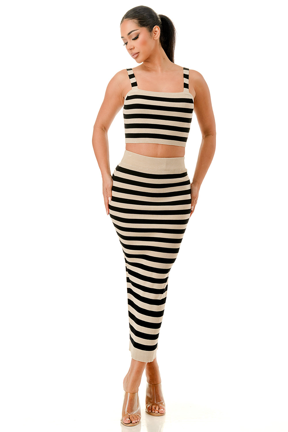 Striped take top with adjustable matching stripes on the strape. Matching striped midi skirt.